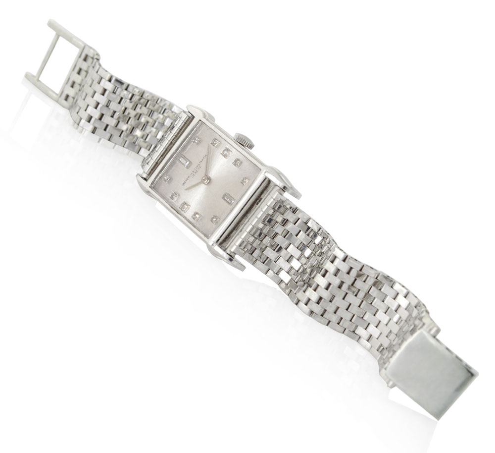 Cassa n. 321009 rettangolare in platino con anse sporgenti (buono). Quadrante argentato con indici in diamanti taglio brillante e baguette (originale, indelebile, ottimo). Movimento di forma n. 473334 a carica manuale (ottimo). Quadrante, cassa e movimento firmati. Bracciale dell'epoca anonimo in oro bianco 18 kt.