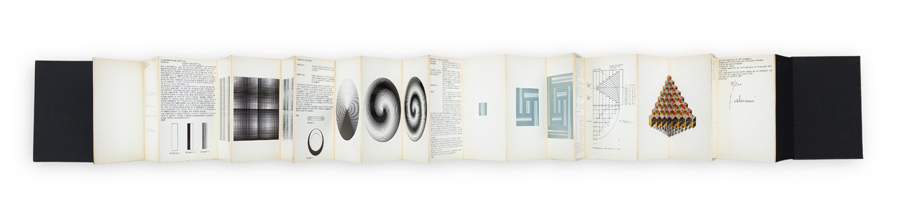 Libro d'arte a fisarmonica composto da 24 pagine con numerose riproduzioni di opere dell'Artista e illustrazioni che descrivono esperimenti tecnici sulla percezione visiva