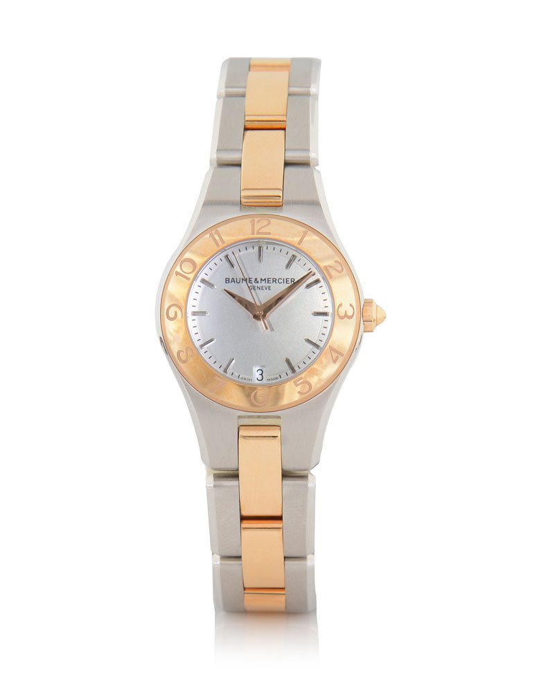 Diam. mm 27. C. stainless steel and 18K pink gold, bezel with engraved Arabic numerals (very good). D. mother-of-pearl with applied indexes, centre seconds and date at 6 (very good). M. quartz (very good). Stainless steel and pink gold bracelet with double-deployant clasp. Dial, case, movement and bracelet signed. Accompanied by Baume & Mercier box and certificate.
