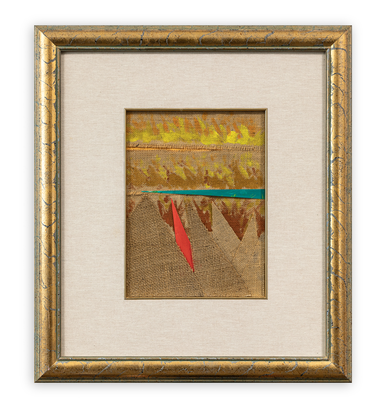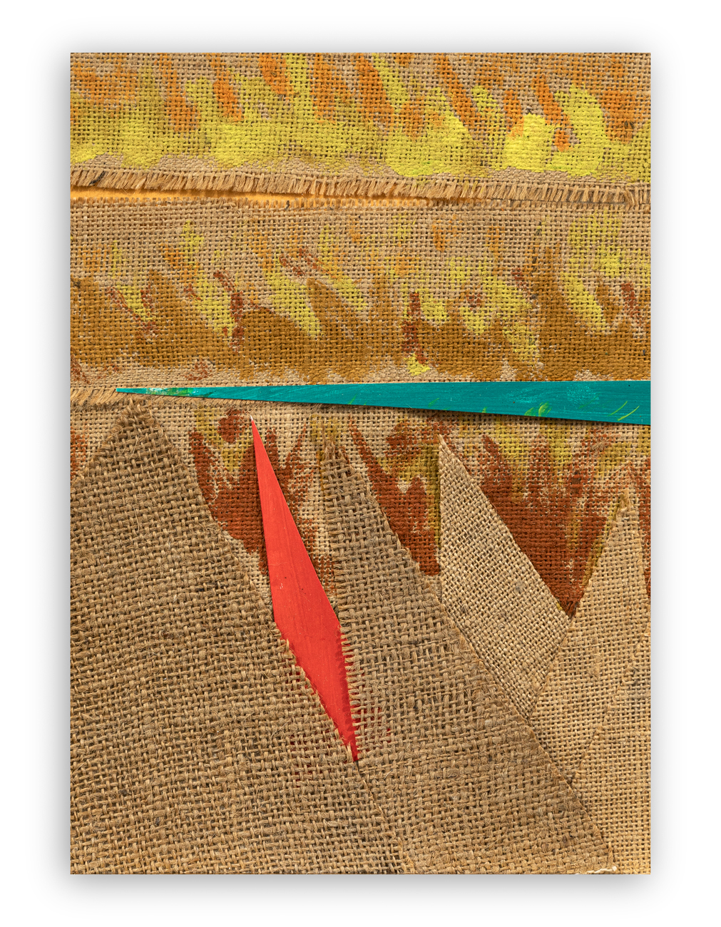 Tecnica mista e applicazioni di carte e tela di juta su tavola
