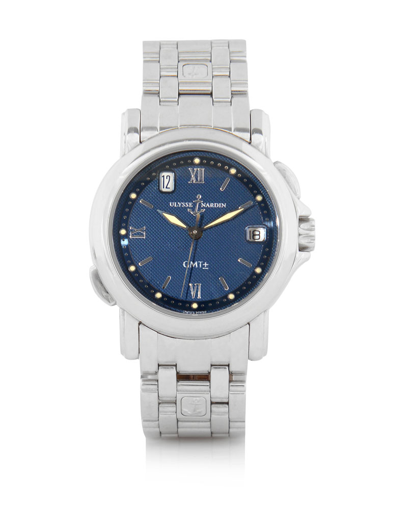 Diam. mm 35. C. stainless steel, case back secured by screws, push button at 2 and 8 to activate the settable hour, sapphire crystal (very good). D. blue with applied indexes and Roman numerals, luminous indexes and hands, centre seconds, date at 3 and aperture at 11 for the second time zone (very good). M. self winding (very good). Stainless steel bracelet. Dial, case, movement and bracelet signed. Accompanied by Ulysse Nardin box and booklet.