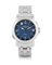 Cassa in acciaio con fondello chiuso da viti, vetro zaffiro, due pulsanti laterali al 2 e 8 per la rimessa rapida delle ore, vetro zaffiro (ottimo). Quadrante blu con indici e numeri romani applicati, indici e lancette luminescenti, secondi al centro e data al 3, finestrelle con 24 ore per secondo fuso orario all'11 (ottimo). Movimento a carica automatica (ottimo). Bracciale in acciaio. Quadrante, cassa, movimento e bracciale firmati. Completo di astuccio e certificato e libretto originale.