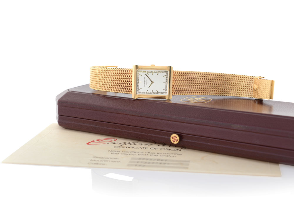 Dim. mm 30x25, lungh. cm 18. C. rectangular 18K yellow gold resembling a Greek temple (very good). D. white with applied indexes surrounded by gold Greek motif (original, very good). M. manual winding (very good). 18K yellow gold integrated bracelet. Dial, case, movement and bracelet signed. Accompanied by Patek Philippe box and certificate dated 05/1992.