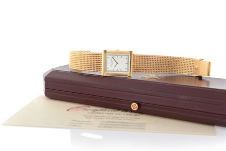 Cassa n. 2808032 rettangolare in oro giallo 18 kt, decoro sul fronte di capitelli e colonne stilizzate (ottimo). Quadrante bianco con indici applicati e greca geometrica periferica e dorata (originale, ottimo). Movimento n. 1367896 a carica manuale (ottimo). Bracciale incorporato in giallo 18 kt. Quadrante, cassa, movimento e bracciale firmati. Completo di astuccio e certificato del 05/1992.