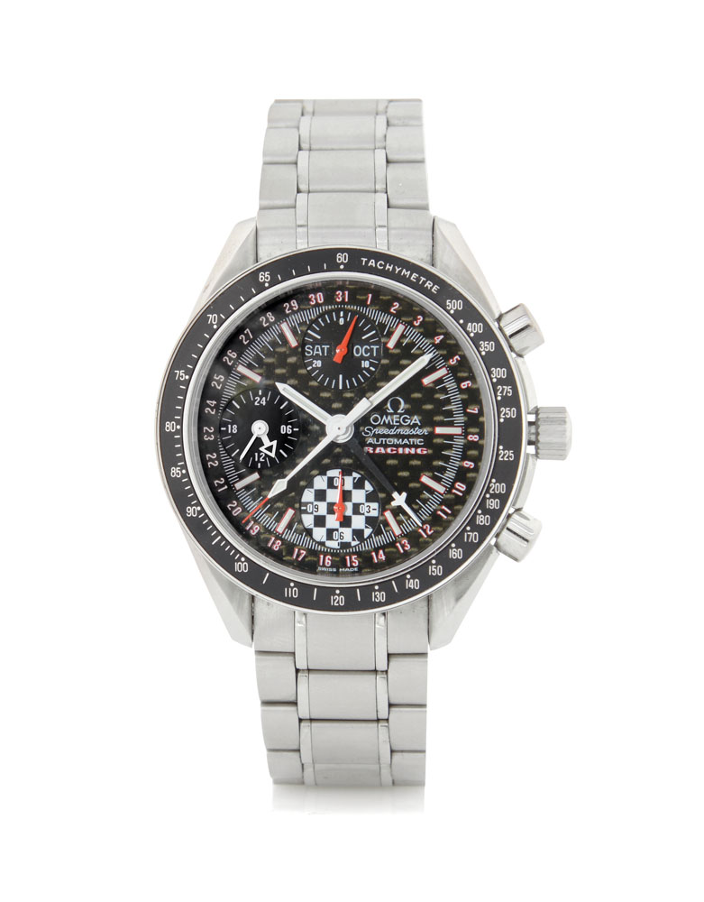 Diam. mm 39. C. stainless steel with Schumacher signature on the case back, black bezel with tachymetre scale calibrated for 500 UPH (very good). D. carbon fibre with luminous indexes and hands, 30 minute and 12 hour registers, 24 hours at 9, aperture for day and date at 12, outermost date scale with corresponding hand (as new). M. cal. 1151 self- winding (very good). Stainless steel bracelet. Dial, case, movement and bracelet signed. Accompanied by Omega box and certificated dated 12/2004.