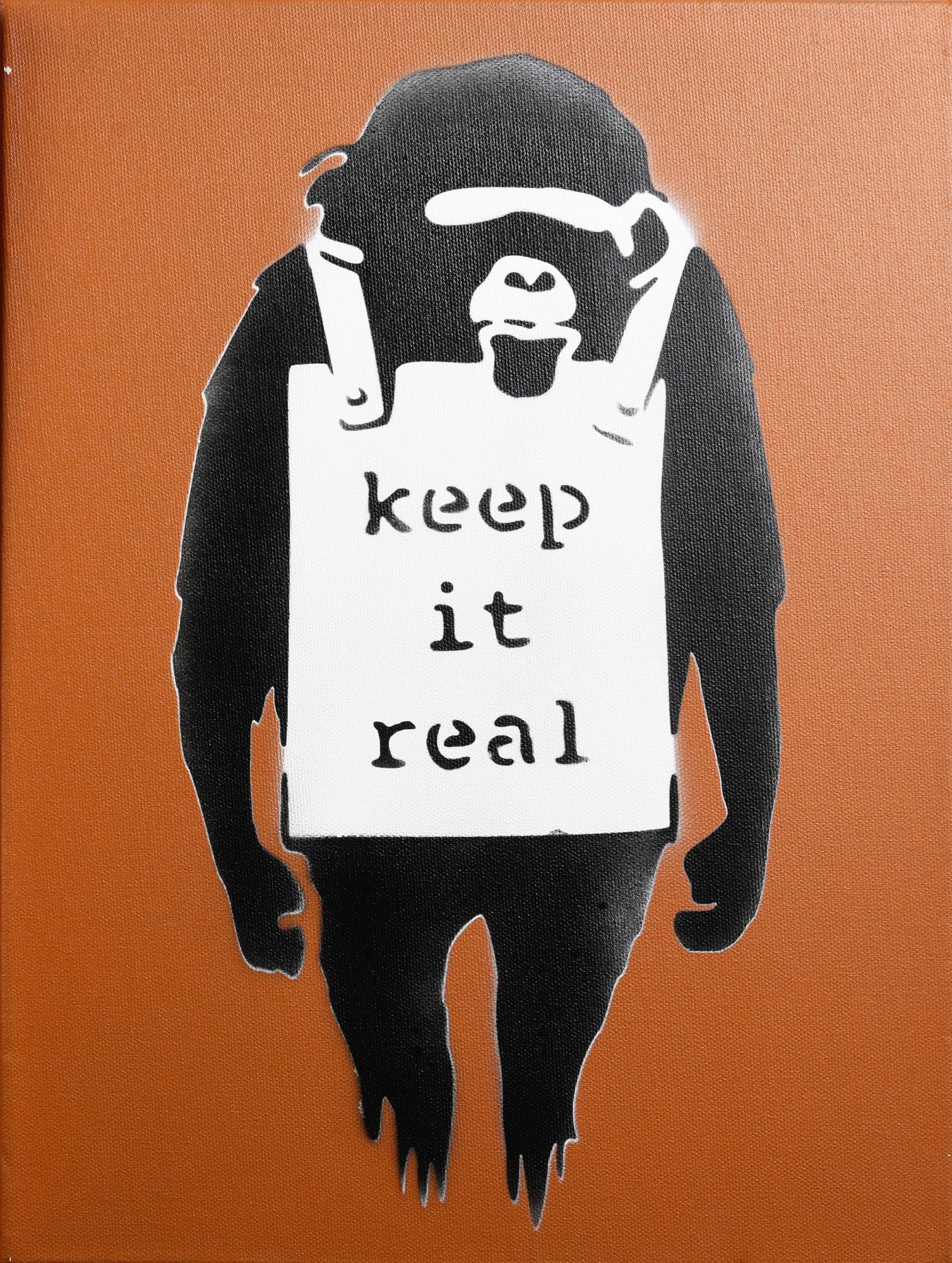 Banksy KEEP IT REAL spray stencil su tela, cm 40x30x4; es. 1/50 firma a...