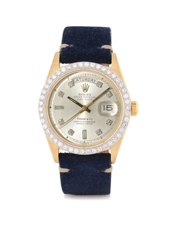 ROLEX OYSTER PERPETUAL DAY-DATE REF. 1803 DEL 1976/77 CA. PERSONALIZZATO PER TIFFANY & CO. Cassa n. 5152573 in oro giallo 18 kt con fondello e corona a vite, lunetta in oro bianco e brillanti (ottimo). Quadrante argentato con indici in diamanti taglio brillanti e baguette, secondi al centro, finestrella per giorno, inglese, al 12 e data al 3 (originale, ottimo). Movimento a carica automatica (ottimo). Quadrante, cassa e movimento firmati.