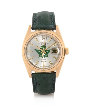 Diam. mm 36. C. 18K pink gold, screwed case back and crown, reeded bezel (very good). D. silvered with Saudi Arabia logo, applied indexes, centre seconds and date at 3 (original, very good). M. self-winding (good). Dial, case and movement signed. Accompanied by Rolex buckle.