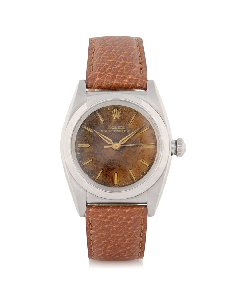 Cassa n. 161711 in acciaio con fondello e corona a vite, lunetta liscia (ottimo). Quadrante marrone, nero virato, con indici applicati e secondi al centro (originale, ottimo). Movimento a carica automatica (buono). Quadrante, cassa e movimento firmati.