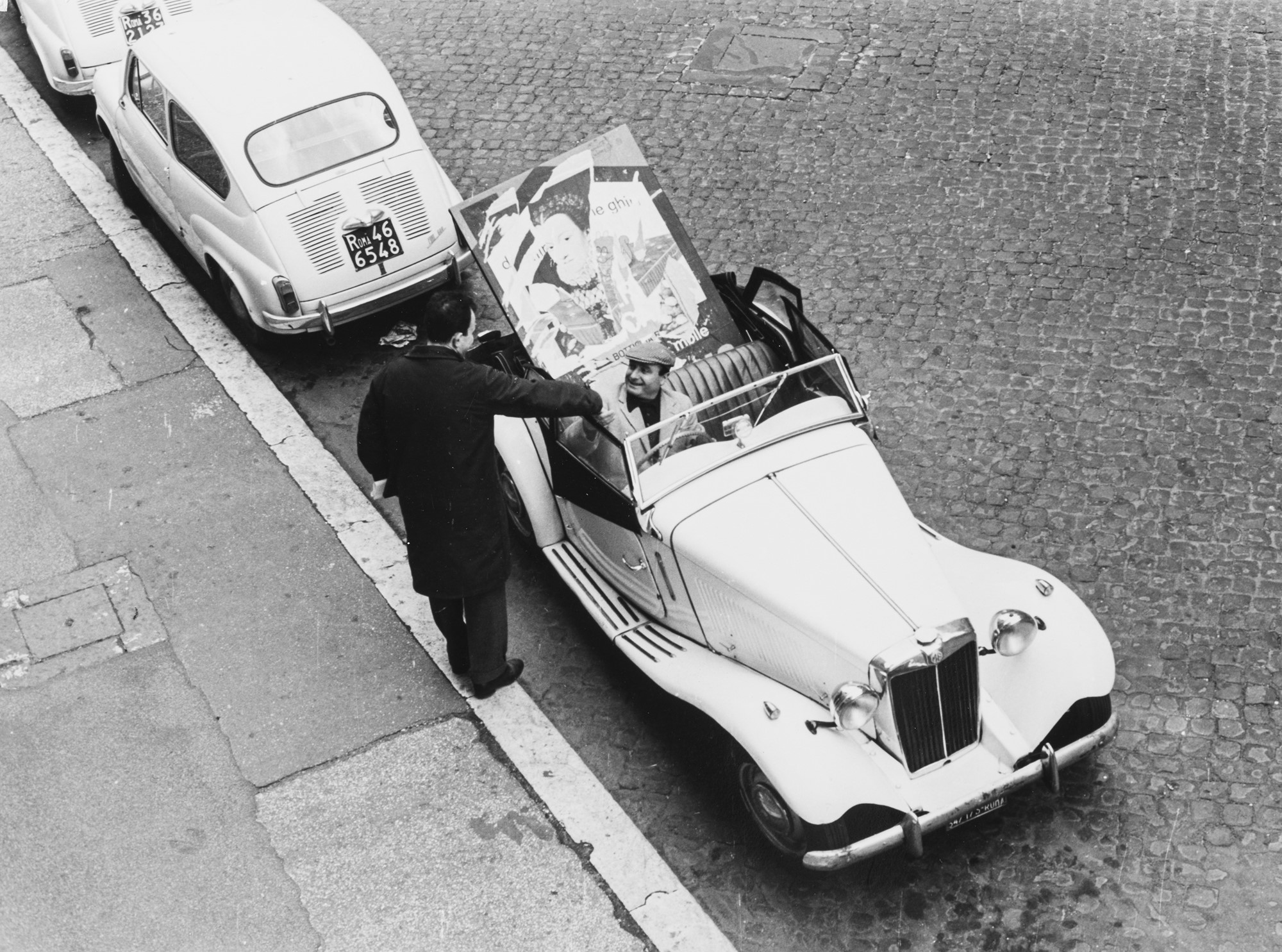 Mario Dondero (1928-2015) - Mimmo Rotella che va a consegnare un'opera ad un collezionista, 1980s