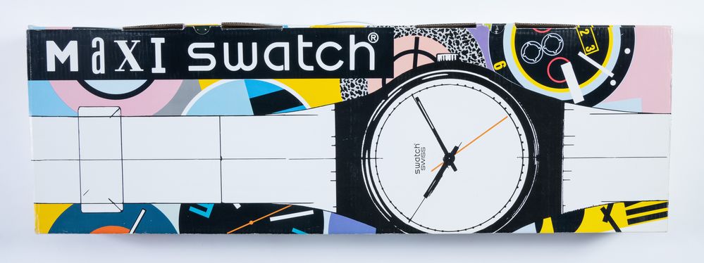 MAXI SWATCH OROLOGIO DA PARETE NUOVO, “EXPO 98”, 1996. Orologio Swatch da parete. Cm 210. Fondo di magazzino con scatola.