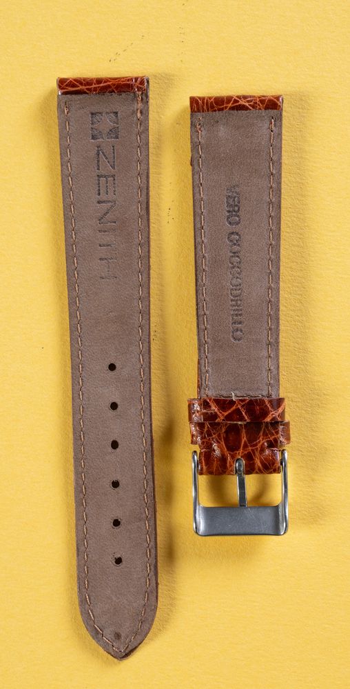 ZENITH, CINTURINO NUOVO, anni '70. Vero coccodrillo, colore marrone, fibbia generica in acciaio, nuovo fondo di magazzino. Diametro 18mm.