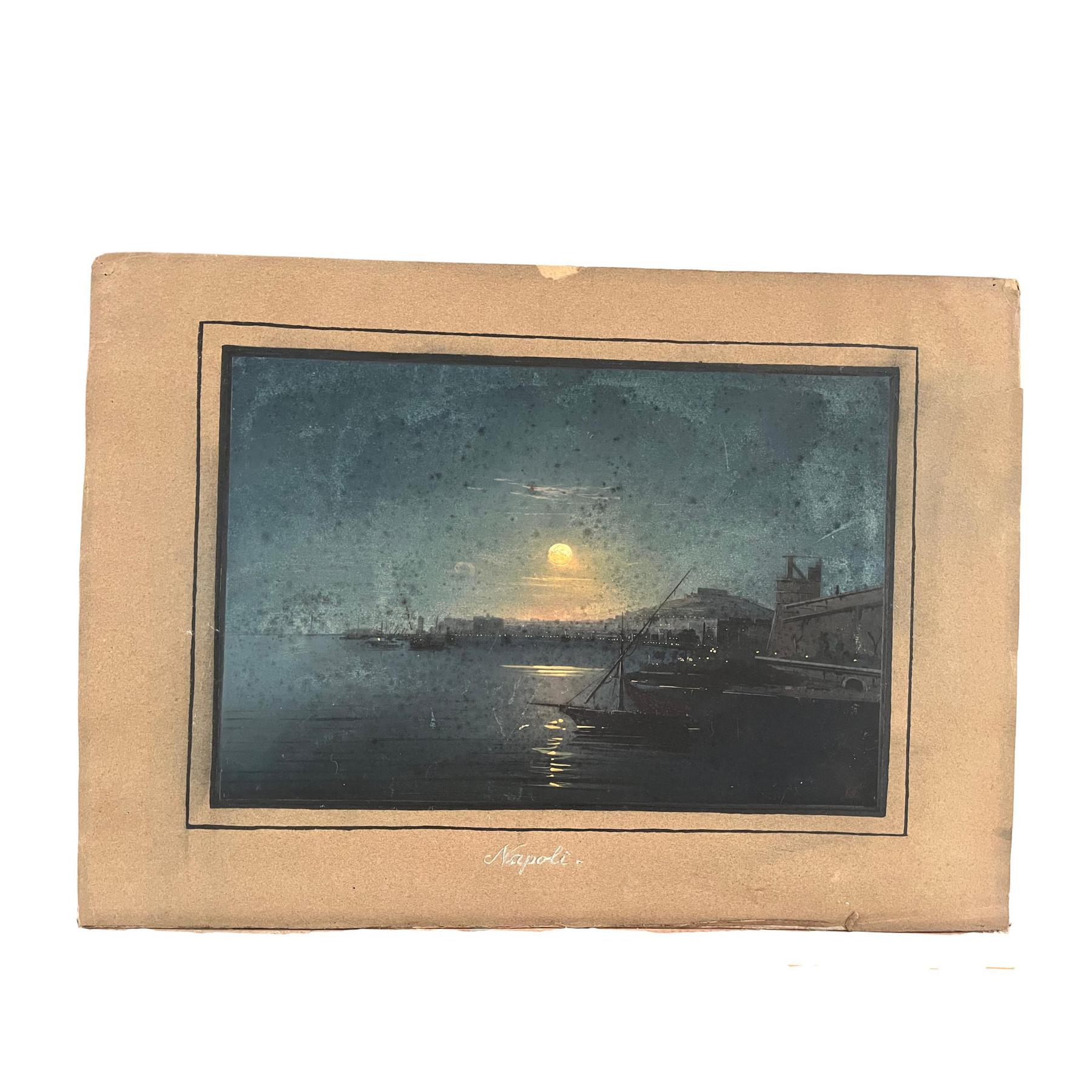 Dipinto Gouache raffigurante Napoli al chiar di luna. Scuola Italia XIX secolo. Artista anonimo.