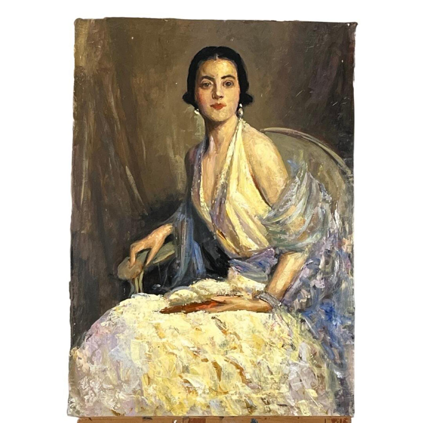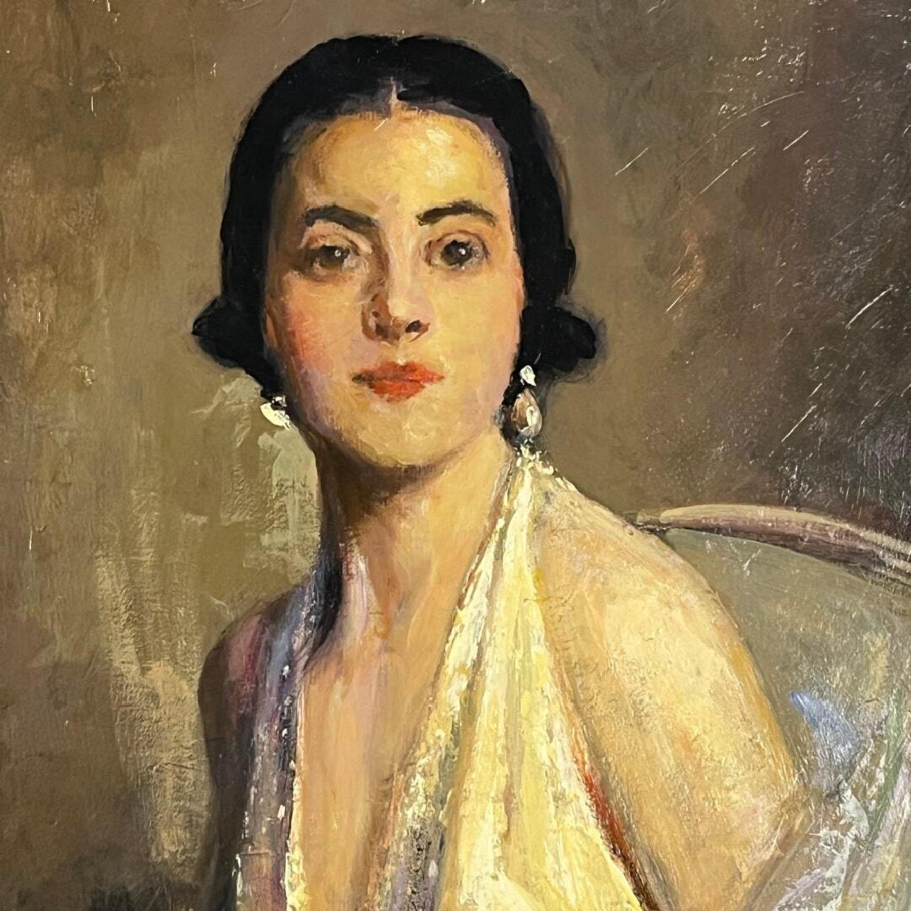 Dipinto olio su tela, raffigurante Ritratto di donna seduta. Scuola Italiana. Alla maniera di Alexius Lazlo. Artista anonimo.