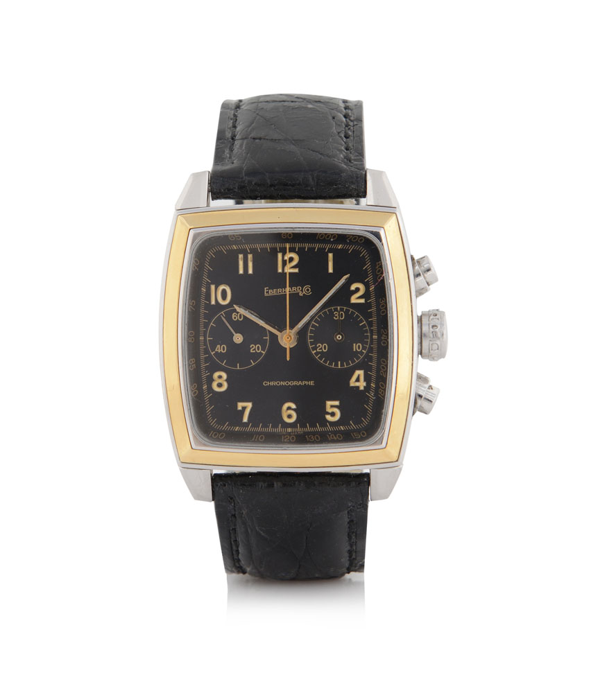 Dim. mm 36x34. C. tonneau-shaped stainless steel and 18K yellow gold, case back secured by screws, round buttons and sapphire crystal (good, scratched on case back). D. black with luminous Arabic numerals, 30 minutes register and tachymetre scale (good). Dial, case and movement signed. Accompanied by Eberhard stainless steel buckle.