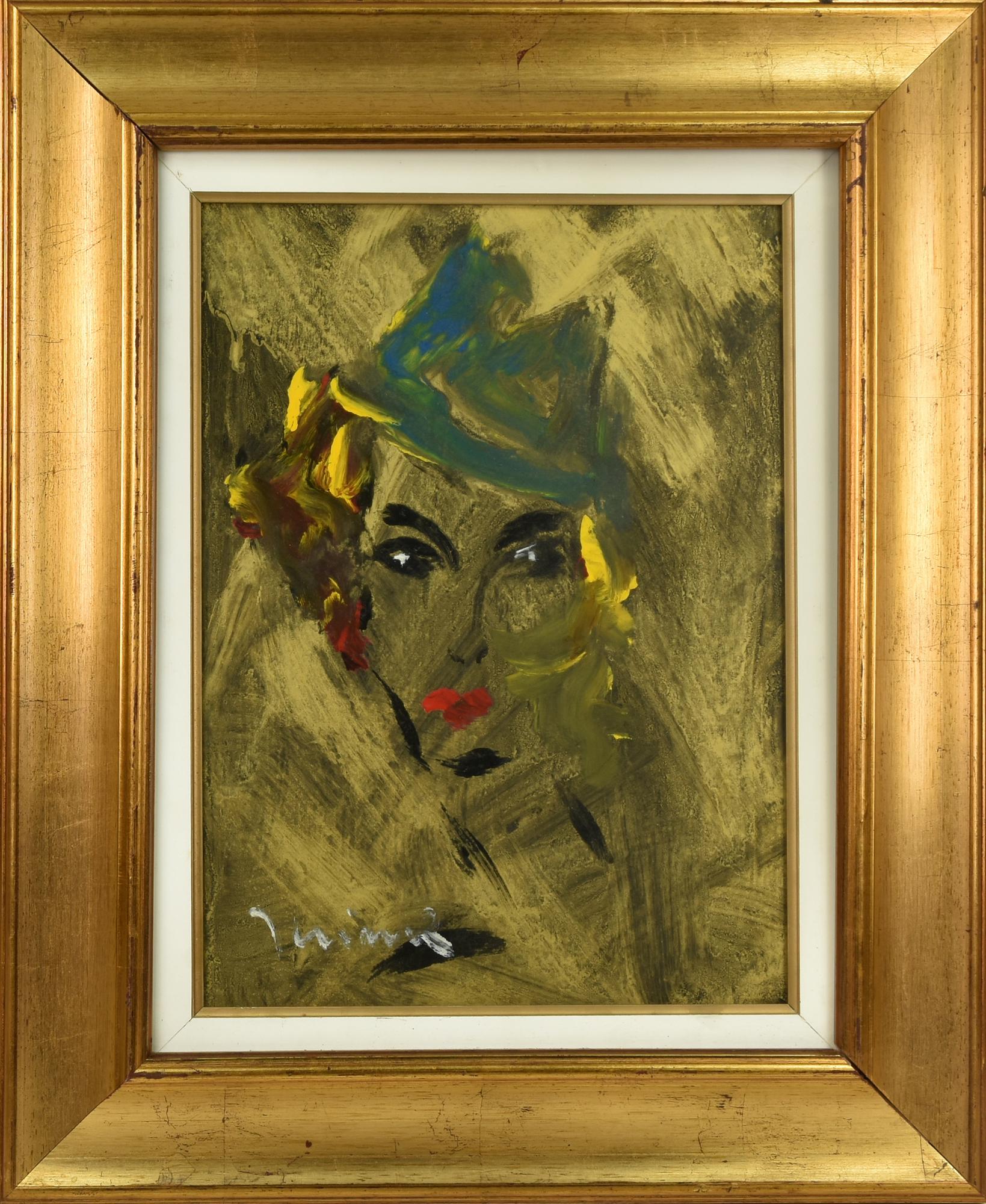 Lot 159 | Harry Jelinek DONNA CON CAPPELLO tecnica mista su faesite, cm 47x34 firma