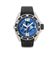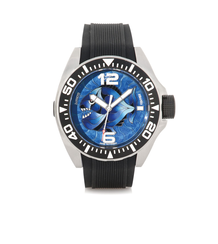 Cassa massiccia in acciaio con fondello a vite, lunetta nera graduata e girevole e vetro zaffiro, valvola ad ore 9 per l'espulsione dei gas (inusato). Quadrante in smalto champlevè nei toni del blu con raffigurazione di Piranha al centro, due numeri arabi, indice e lancette luminescenti, secondi al centro (come nuovo). Movimento a carica automatica (come nuovo). Quadrante, cassa, movimento e vetro firmati. Completo di cinturino in gomma, fibbia in acciaio, astuccio e certificato.
