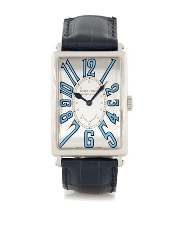 Dim. mm 46x34. C. solid, rectangular, 18K white gold with transparent case back secured by screws (very good). D. silvered with painted blue Arabic numerals and central 24 hours (as new). M. n. 789 self- winding (as new). Dial, case and movement signed. Accompanied by Dubuis strap, 18K white gold buckle, box, certificate dated 06/2000 and Besancon's certificate.