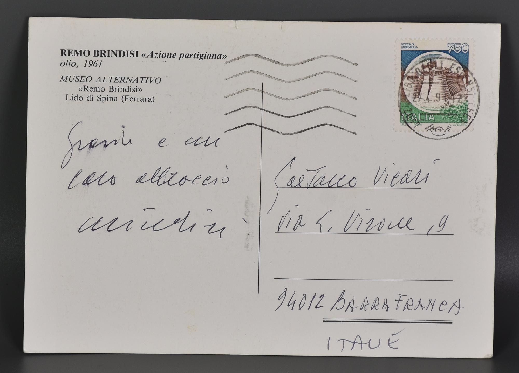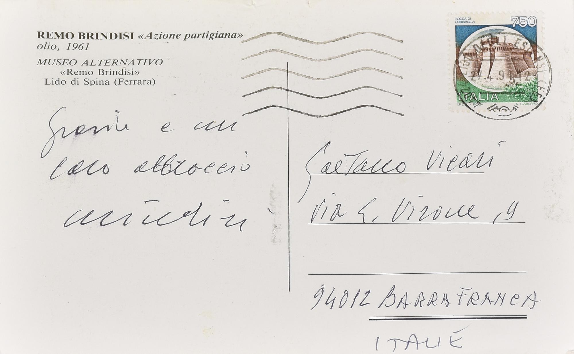 Remo Brindisi AZIONE PARTIGIANA collage su cartolina raffigurante il dipinto...