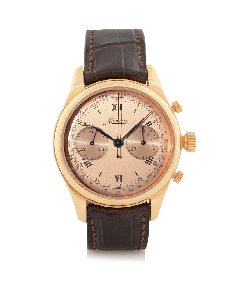 Diam. mm 40. C. solid, 18K yellow gold with transparent case back secured by screws, round button and sapphire crystals (very good). D. pink with painted Roman numerals, 30 minute register and outer tachymetre scale (as new). M. cal. 13-21, swan-neck regulator, manual winding (very good). Dial, case and movement signed. Accompanied by Minerva strap and 18K yellow gold buckle.