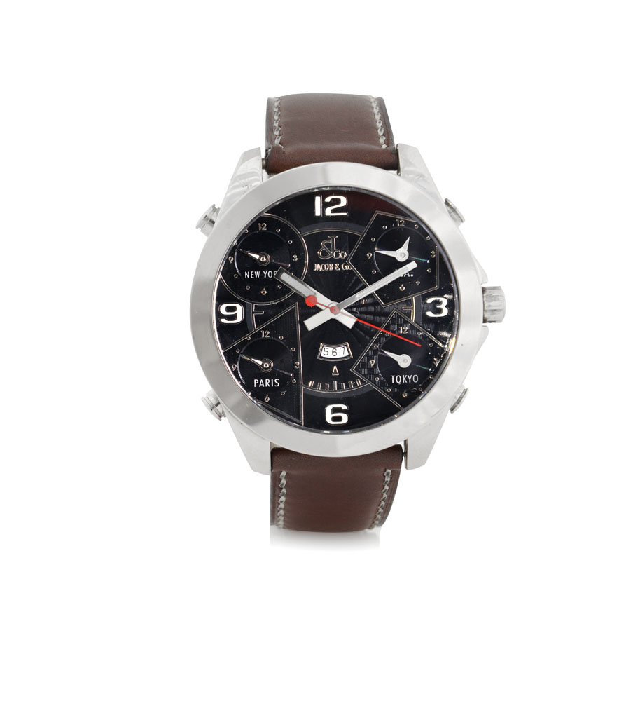 Diam. mm 47. C. stainless steel, screwed case back, five crowns and sapphire crystal (very good). D. black with luminous Arabic numerals, centre seconds and 4 subsidiary dials for time zones (very good). M. 5 swiss quartz (good). Accompanied by Jacob & Co. stainless steel deployant clasp.