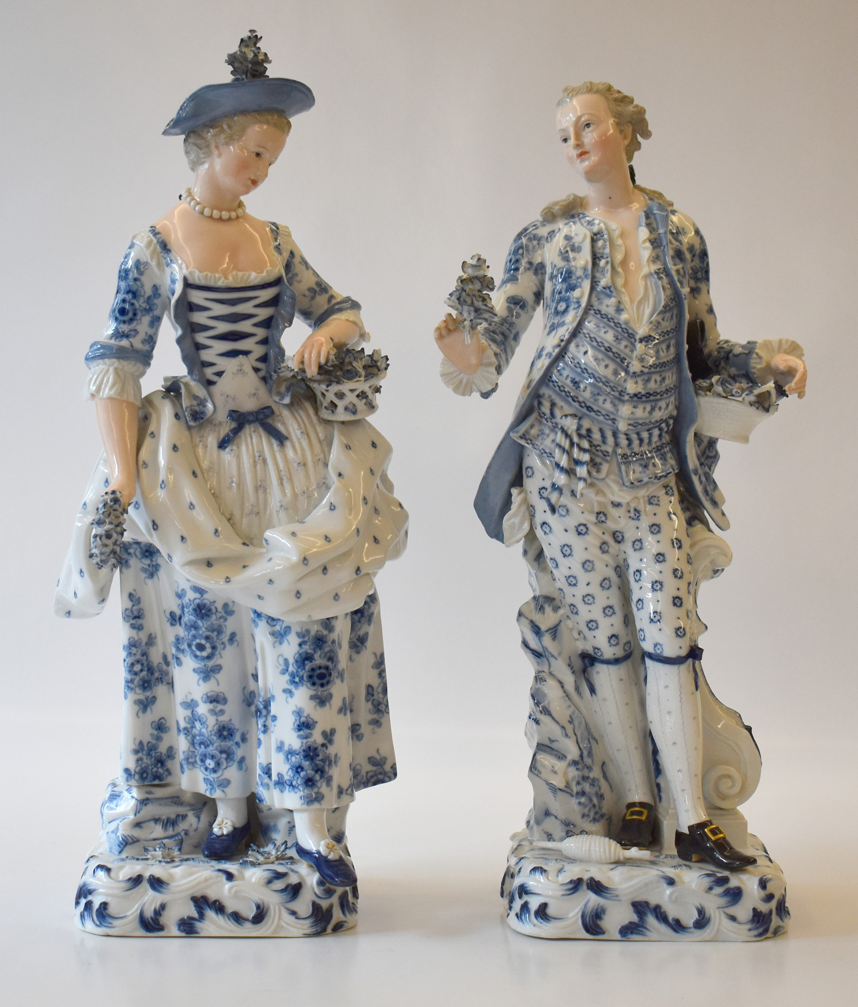 Meissen coppia di grandi figure in porcellana bianca e blu (difetti)
