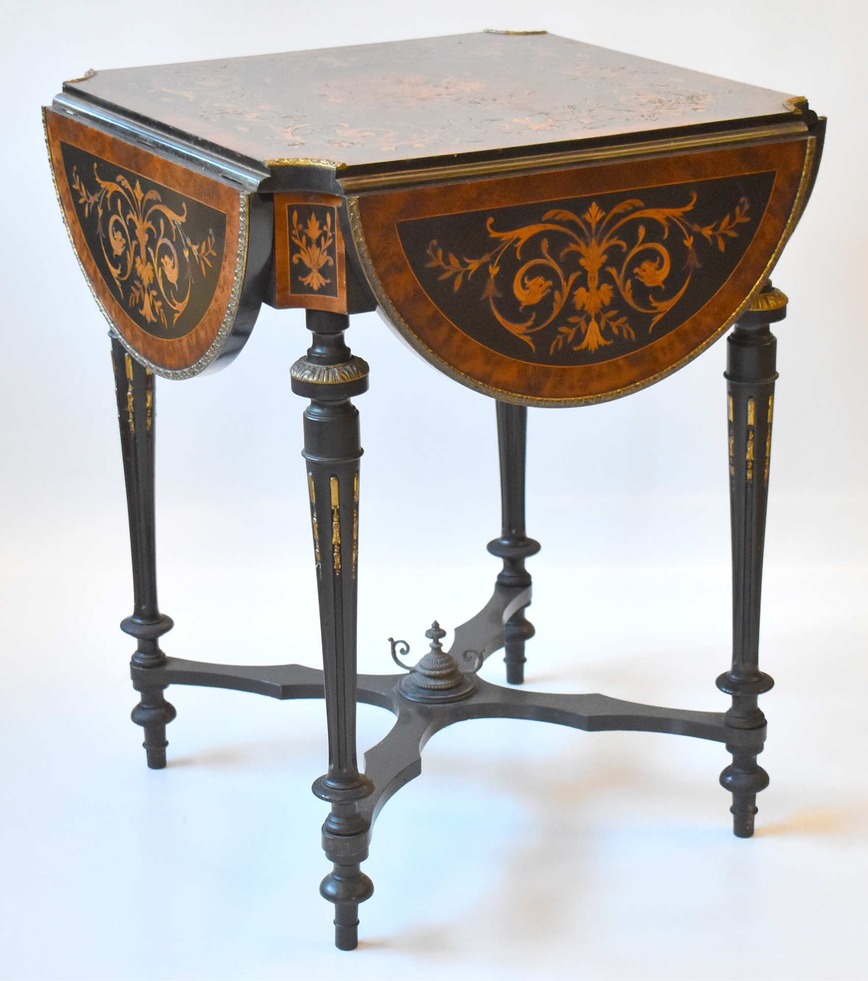 Tavolino a bandelle intarsiato con motivi vegetali e floreali guarniture in bronzo dorato epoca Napoleone III