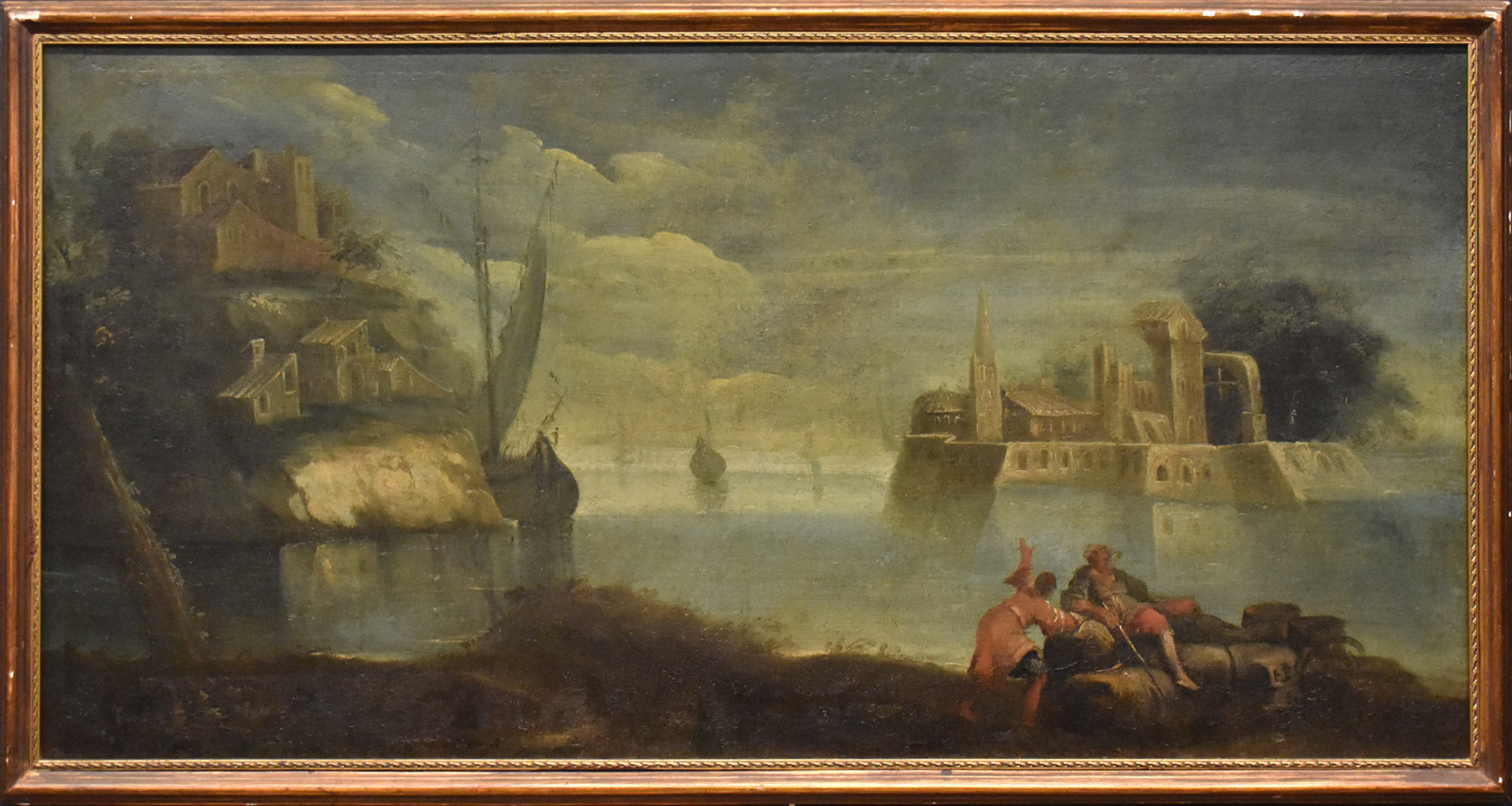'Marina con veduta insulare sullo sfondo' olio su tela scuola veneta fine sec.XVIII