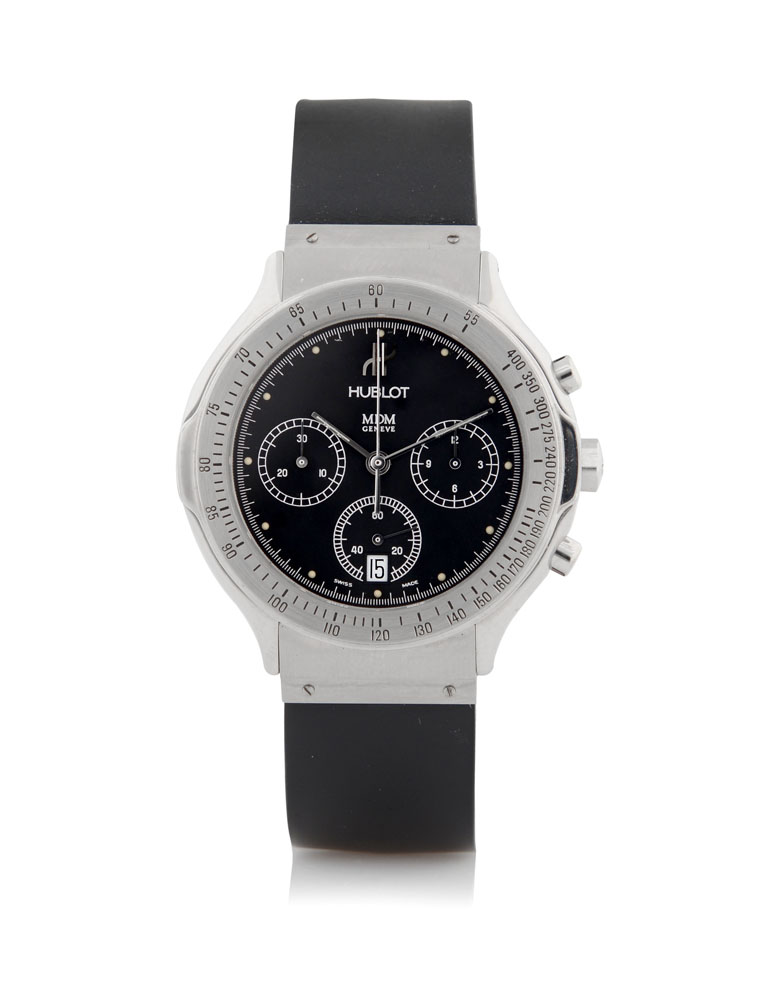 Diam. mm 37. C. stainless steel, case back and lugs secured by screws, round buttons, bezel with tachymetre scale and sapphire crystal (very good). D. black with luminous indexes and hands, 30 minute and 12 hour registers, date at 6 (very good). M. self-winding (good). Dial, case and movement signed. Accompanied by Hublot rubber strap with stainless steel double-deployant clasp, box and certificate.