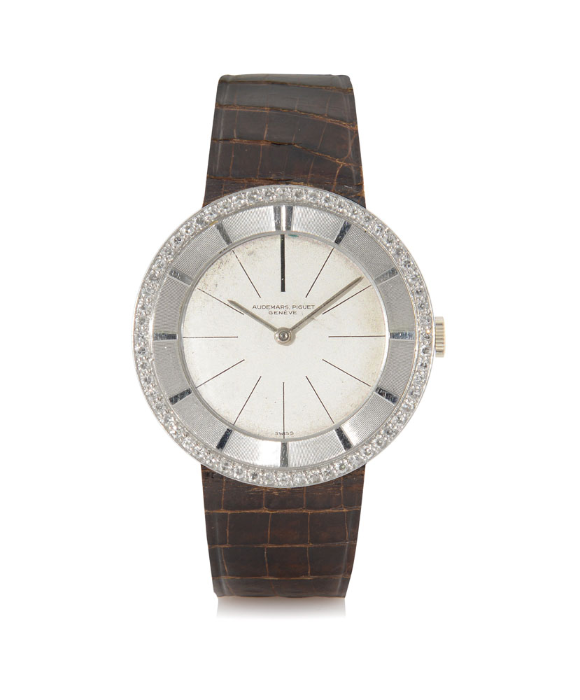 Diam. mm 35. C. slim, platinum, case back secured by screws, hidden lugs, large diamond bezel with sunk indexes (very good). D. silvered with painted indexes (original, good). M. extra-plat, manual winding (very good). Dial, case and movement signed. Accompanied by Audemars Piguet strap and 18K white gold buckle.