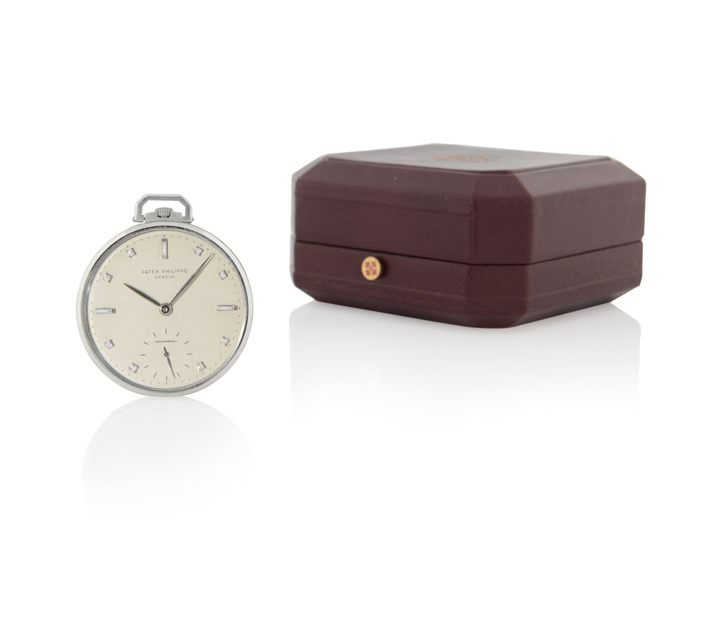 Diam. mm 43. C. platinum, with diamond band and ring (very good). D. silvered with applied diamond indexes, subsidiary seconds (original, very good). M. manual winding (very good). Dial, case and movement signed. Accompanied by Patek Philippe modern box and Extract from the Archives.