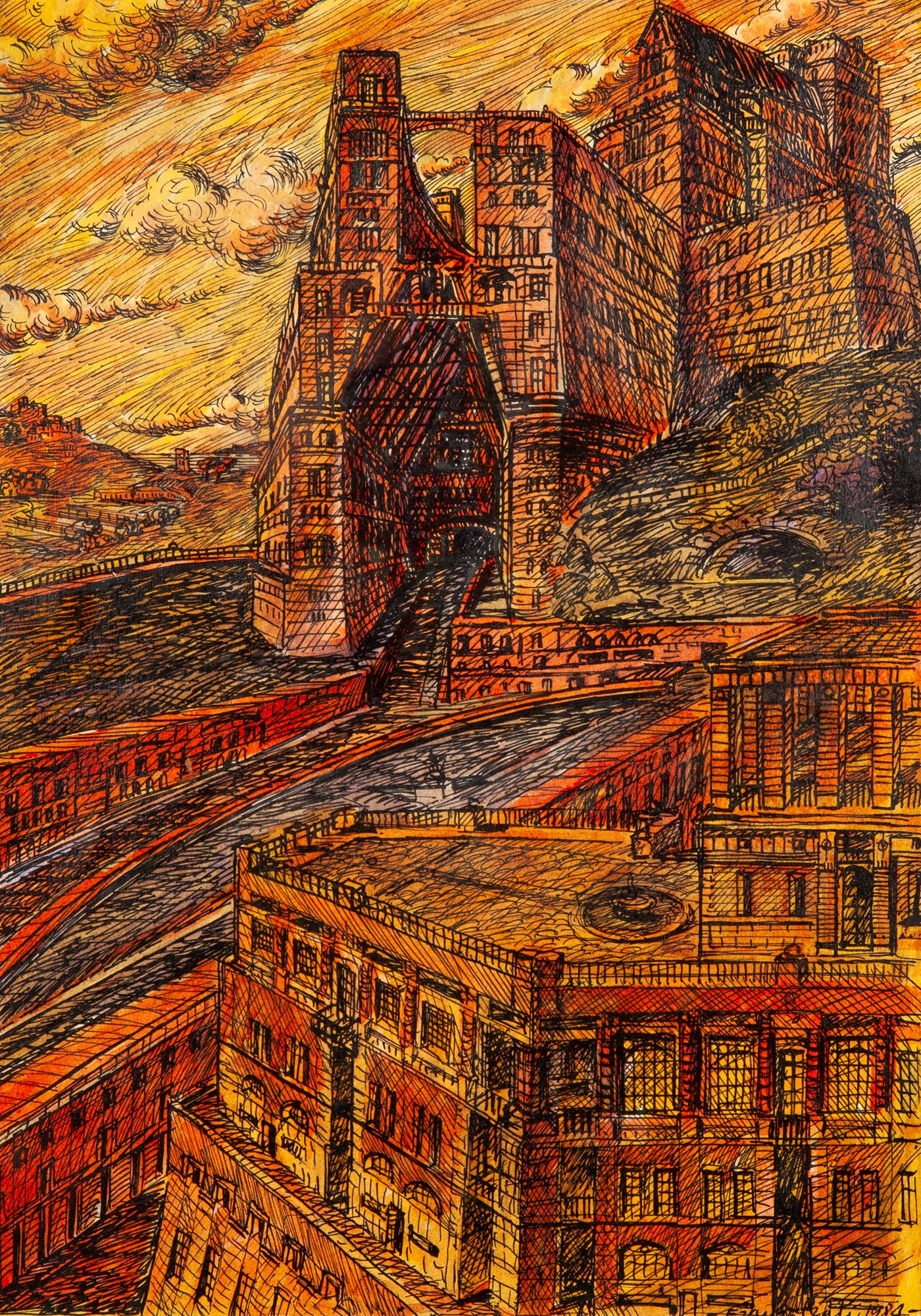 Franz Prati (1944) Veduta di città con fiume 1984 China e acquarello su carta...