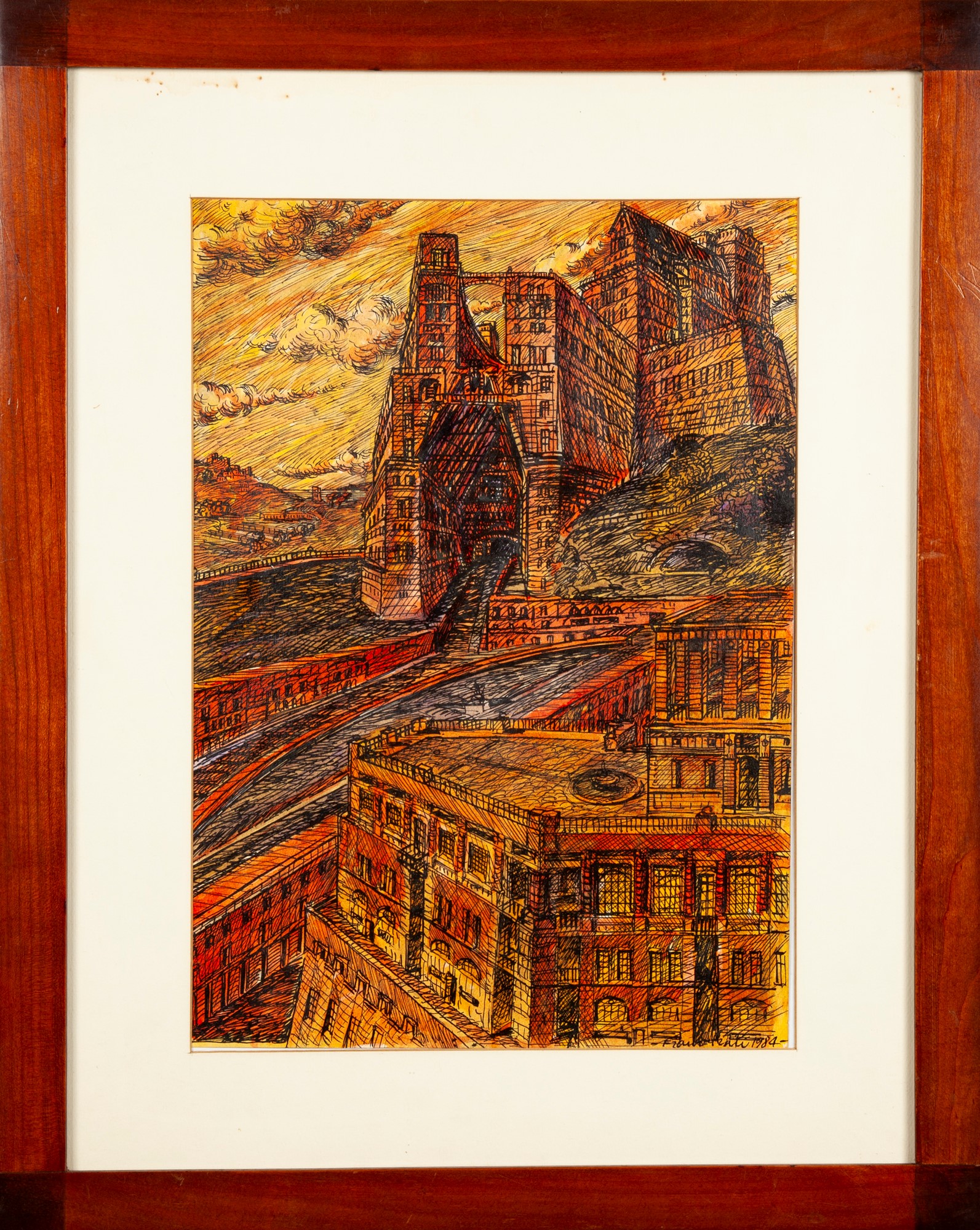 Veduta di città con fiume 1984 China e acquarello su carta cm 42,5x30 - in cornice cm 60,5x48,5 Firma e data in basso a destra "Franz Prati 1984"