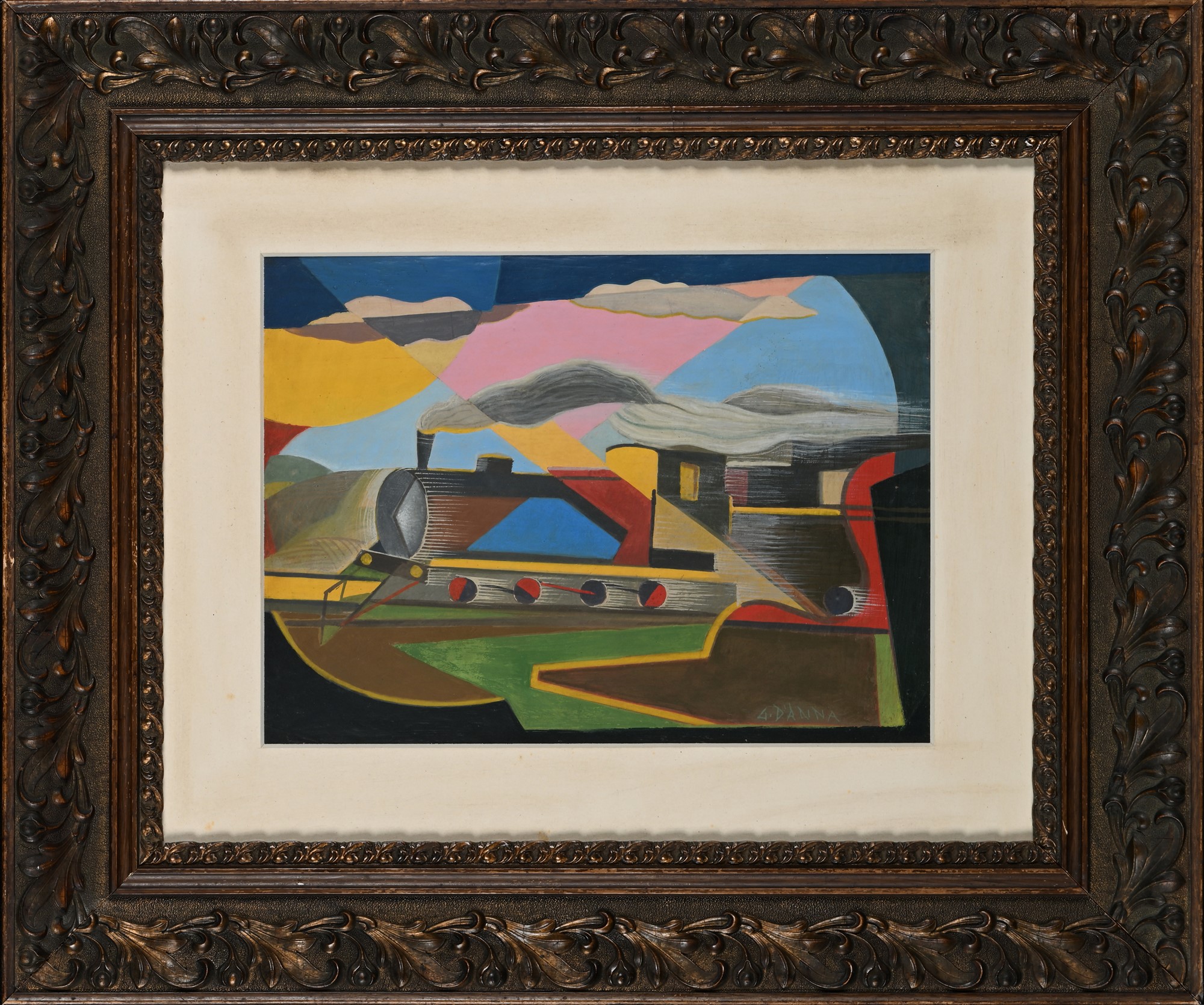 Dinamismo di un treno 1928 ca Olio su cartone cm 28,5x38,5 - in cornice cm 56,5x67,5 Firma in basso a destra "G. D'Anna" Certificato di autenticità rilasciato dall'Archivio Storico dei Futuristi Siciliani