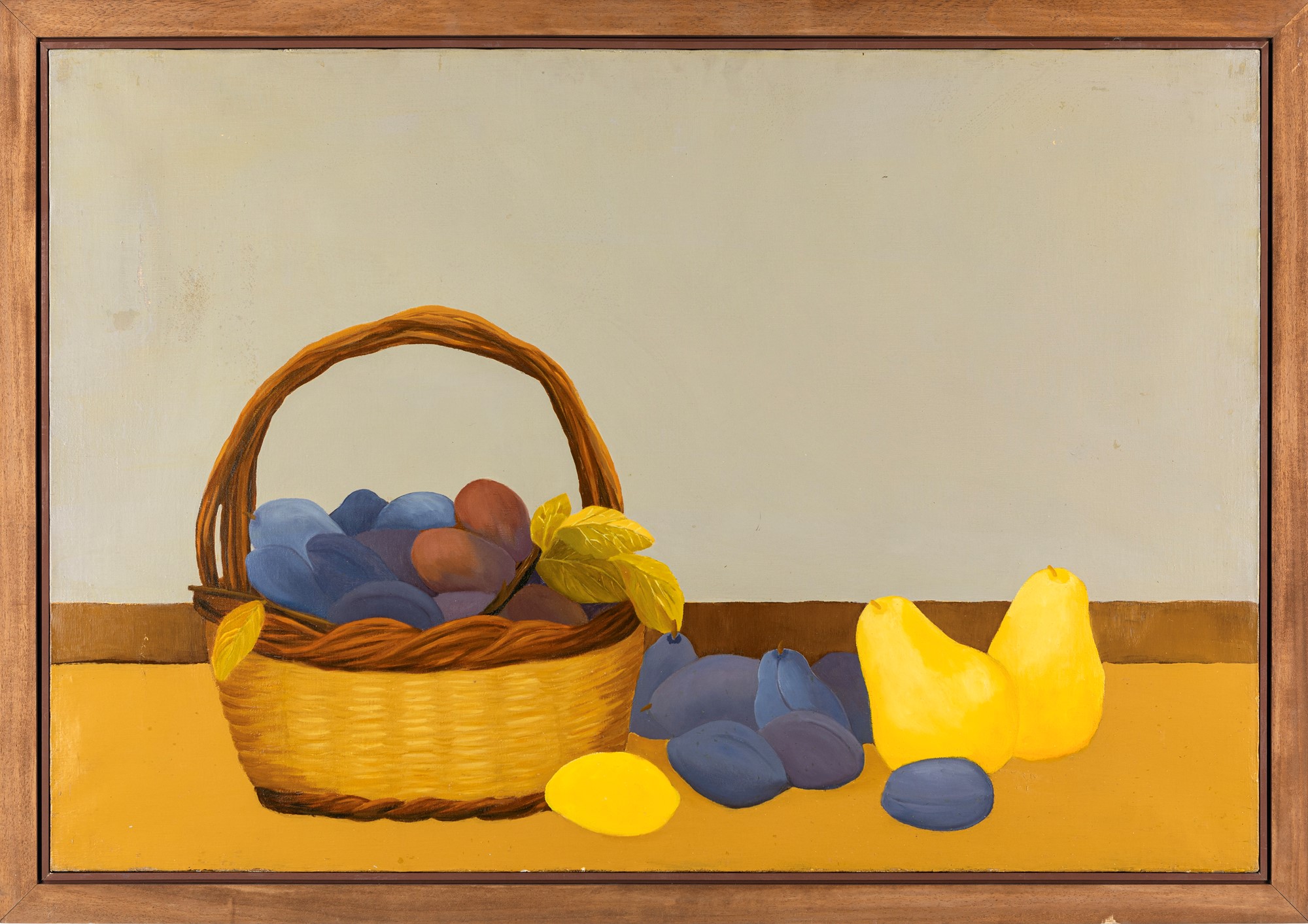 Cesto con Prugne 1996 Olio su tela cm 68x100 - in cornice cm 77x109 Al verso reca firma "Brice Brichetto" e timbro dell'artista Certificato di autenticità su fotografia rilasciato e firmato di pugno dall'artista