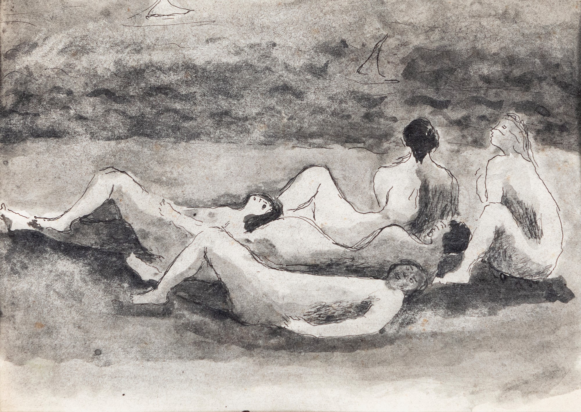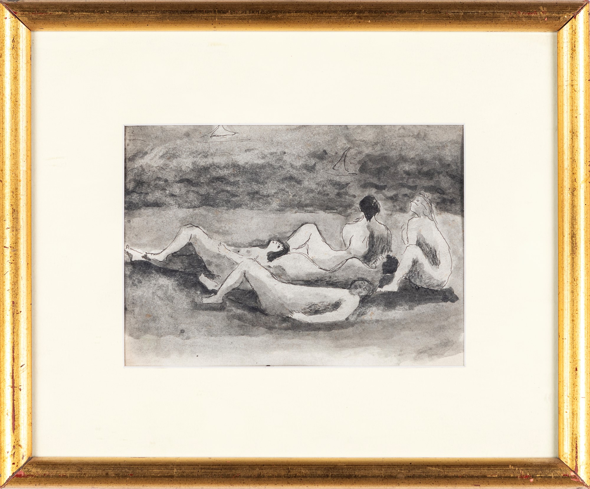 Donne sulla spiaggia China e acquarello su carta cm 19x26 - in cornice cm 37x45