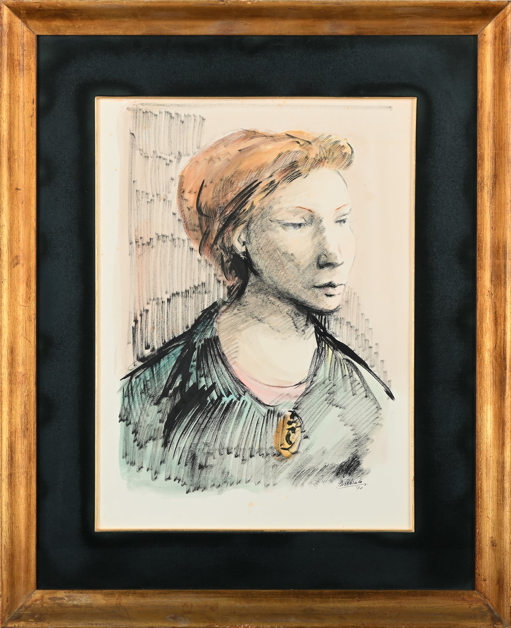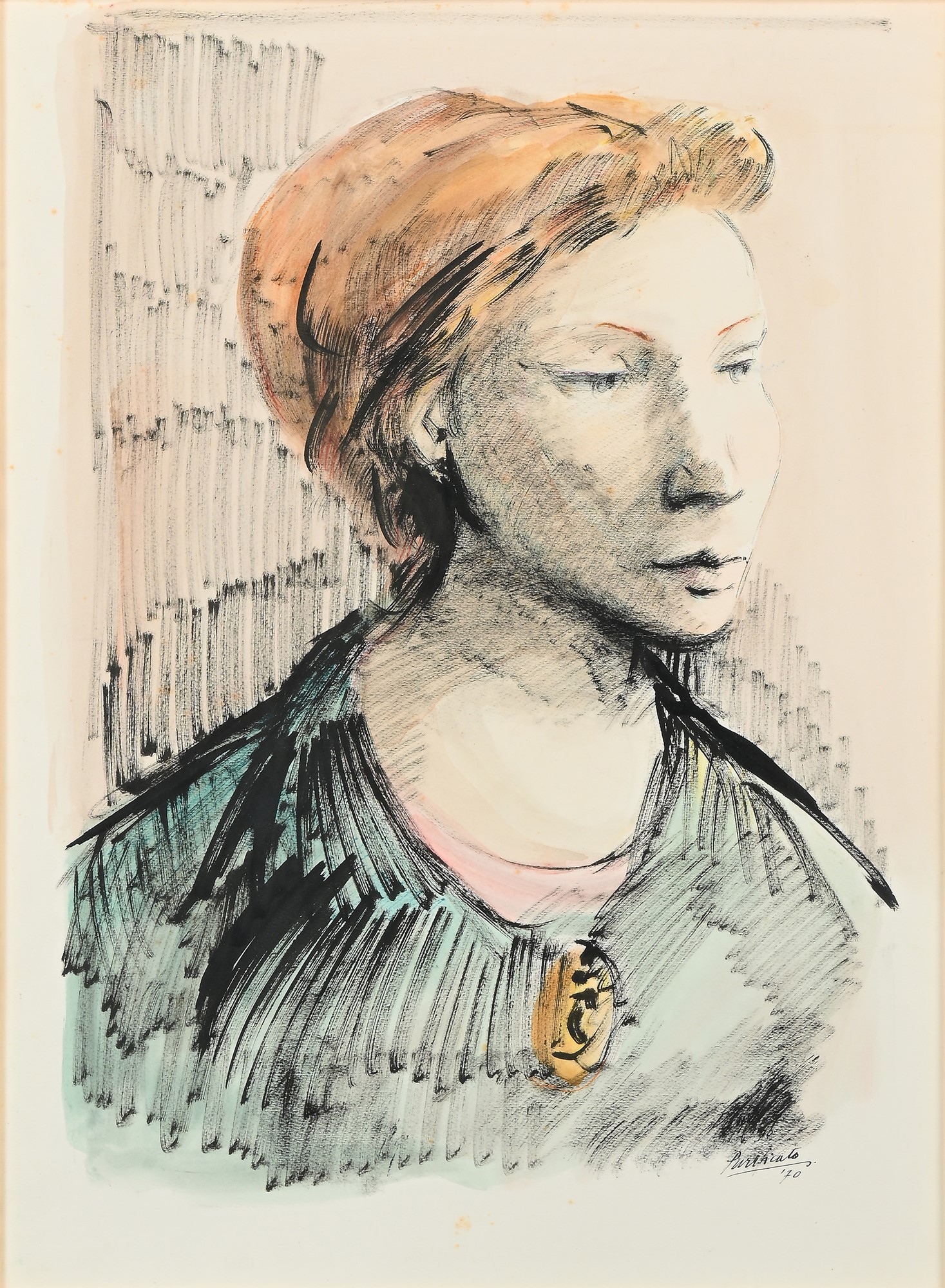 Ritratto di donna 1970 Tempera e acquarello su carta applicata su tela cm 70x50 - in cornice cm 87x71 Firma e data "Purificato '70"