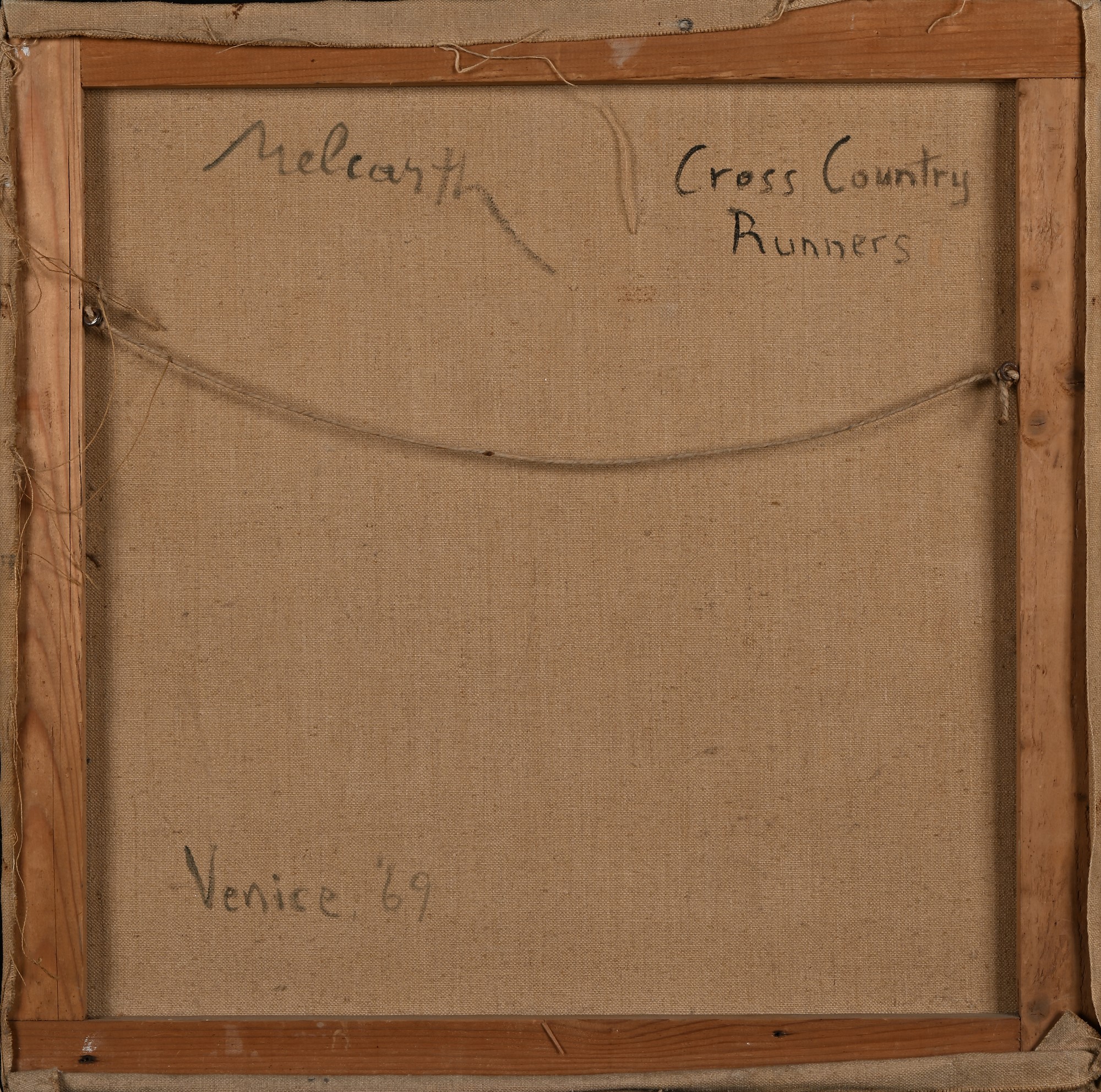 Cross Country Runners 1969 Olio su tela cm 60x60 Firma in alto a destra "Melcarth". Al verso reca firma, titolo e data "Melcarth, Cross Country Runners, Venice '69"