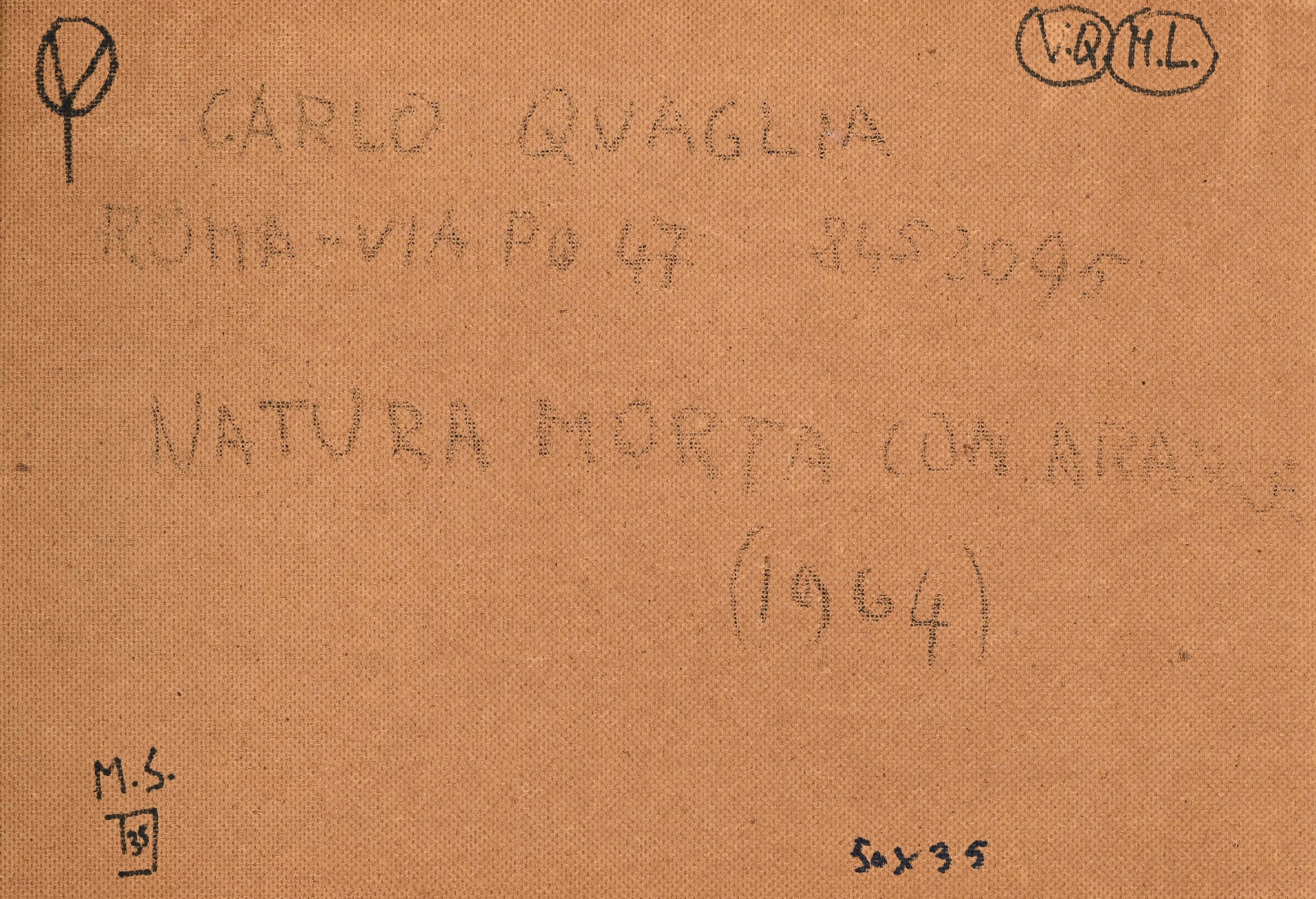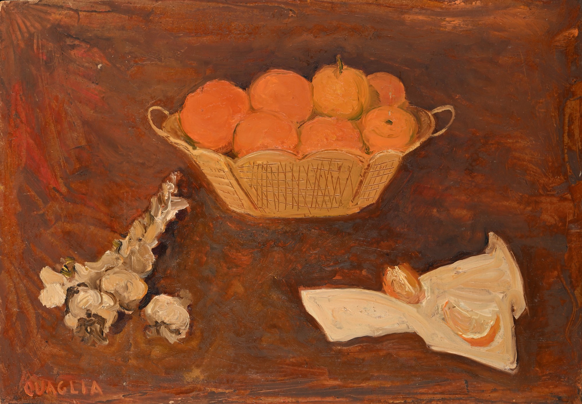 Natura morta con arance 1964 Olio su faesite cm 35x50 Firma in basso a sinistra "Quaglia". Al verso reca titolo e data