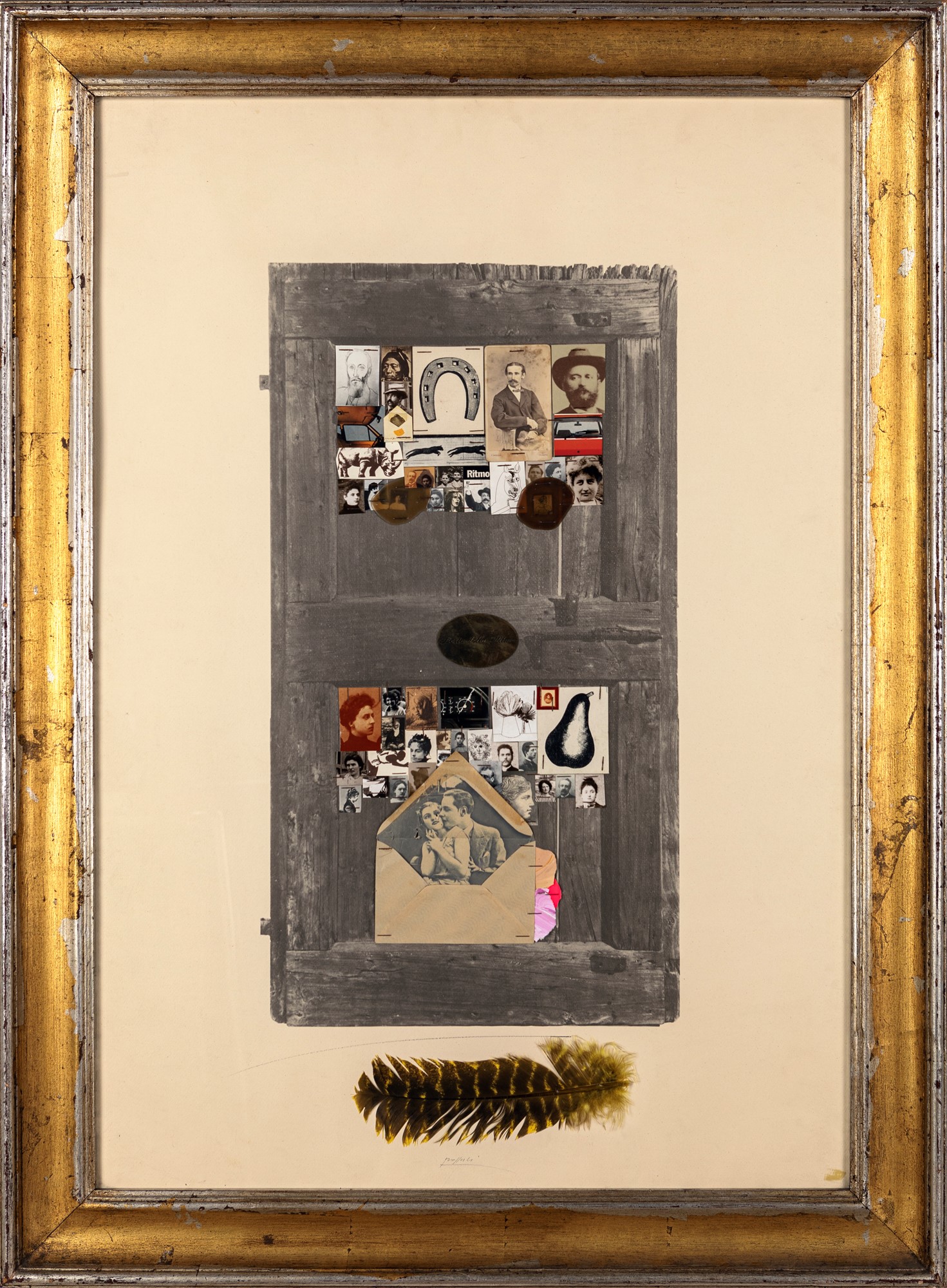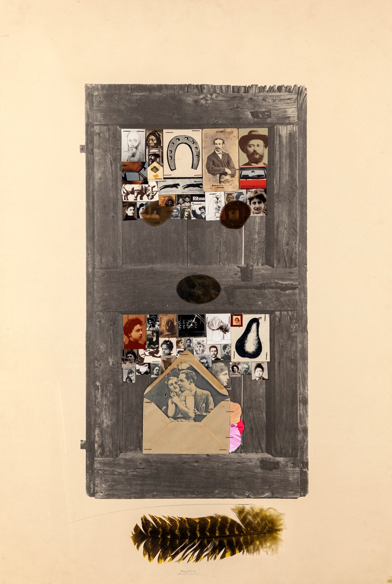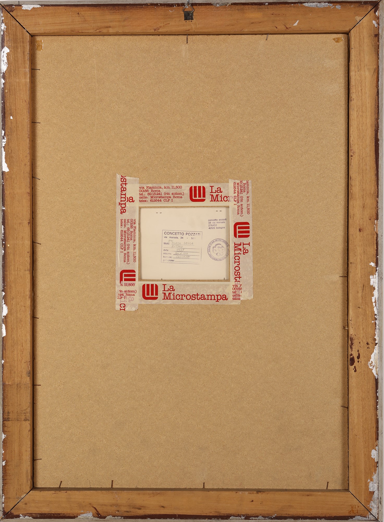 Seconda porta della Ritmo 1979 collage, targhetta metallica e penna su fotolito cm 100x70 - in cornice cm 115x85 Firma in basso a destra "Pozzati". Al verso reca timbro Studio Concetto Pozzati". Certificato di autenticità rilasciato dall'Archivio Concetto Pozzati
