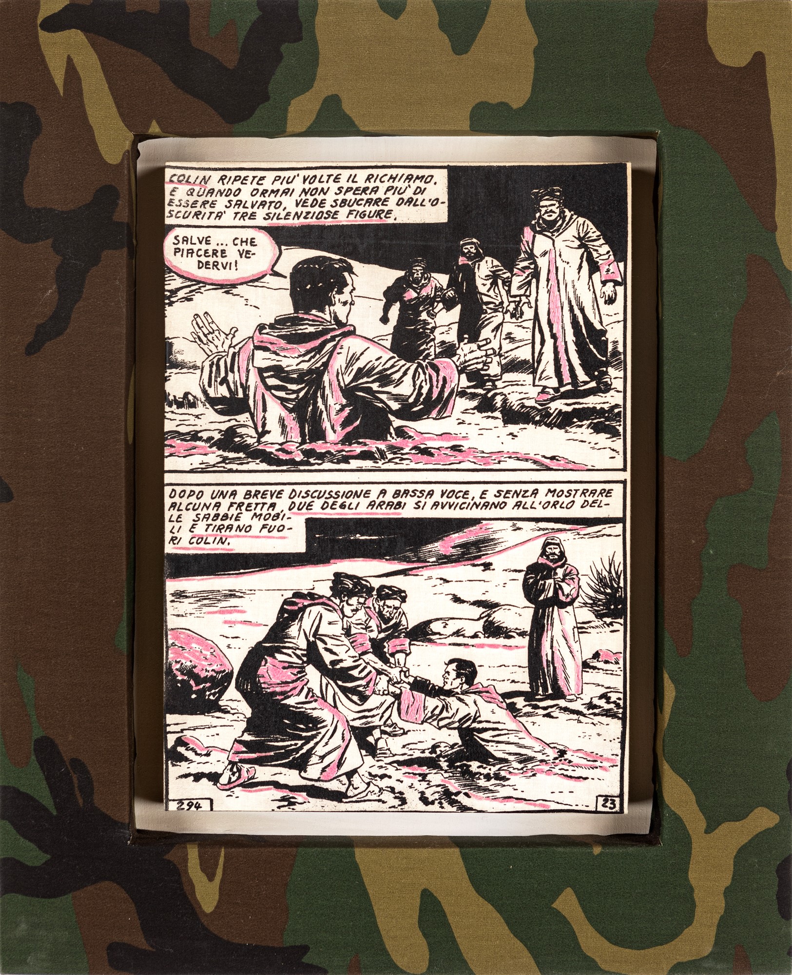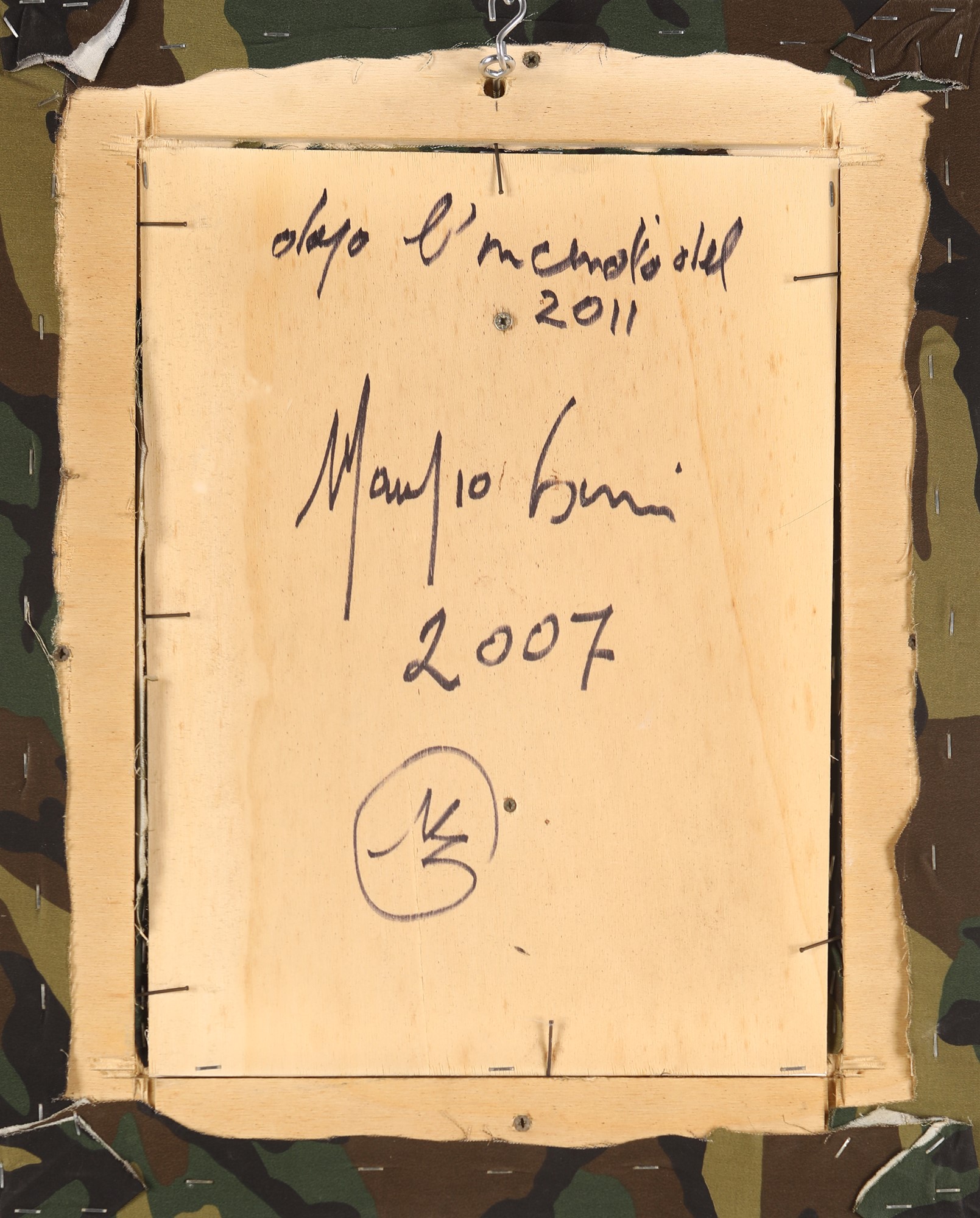 Dall'installazione "No Direction" 2007 Arazzetto serigrafato su stoffa e ricamato a mano con applicazione di colori acrilici cm 52x42 Al verso firma e data "Maurizio Savini 2007" Certificato di autenticità e provenienza rilasciato dalla NextDoor Art Galleria, Roma
