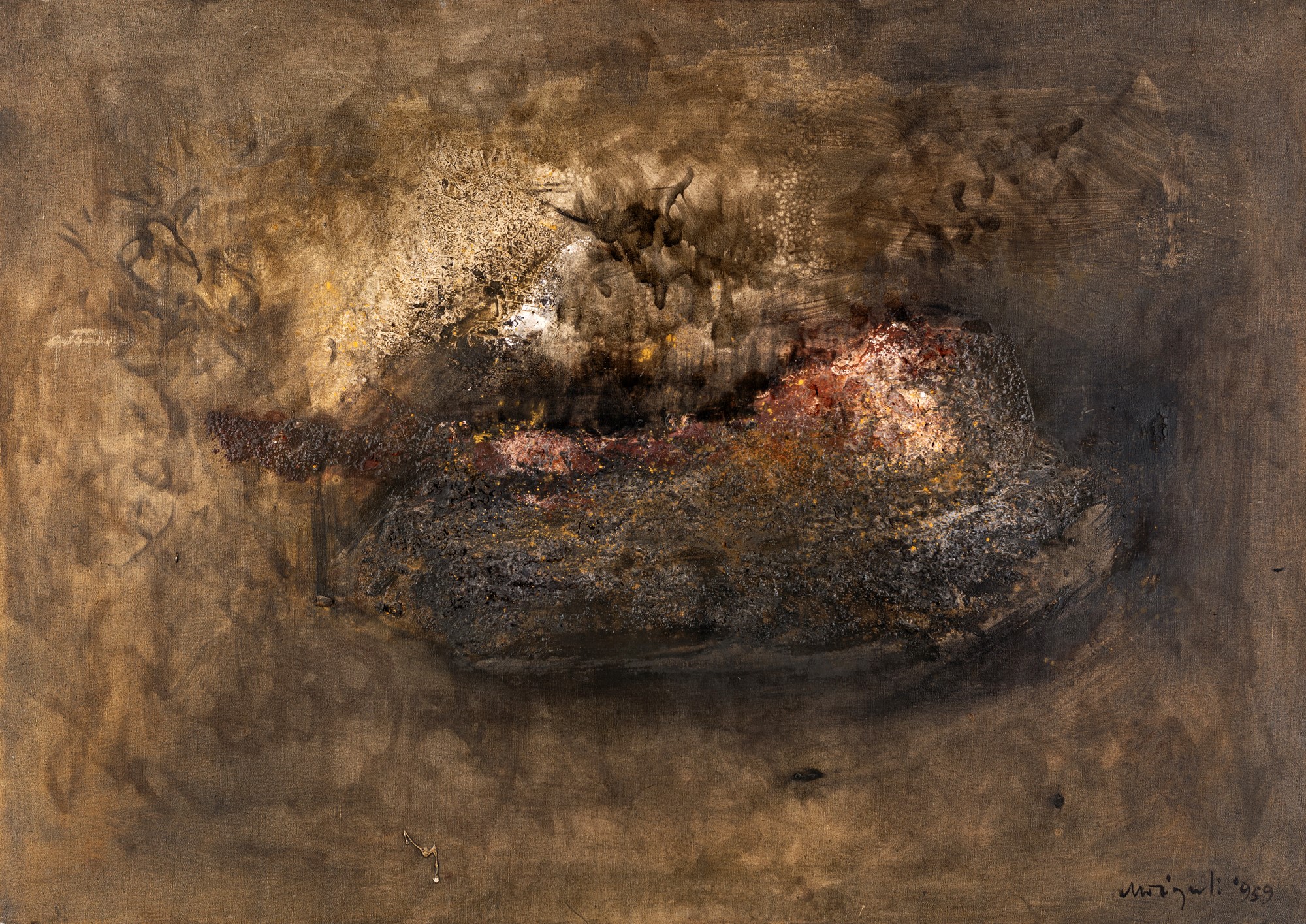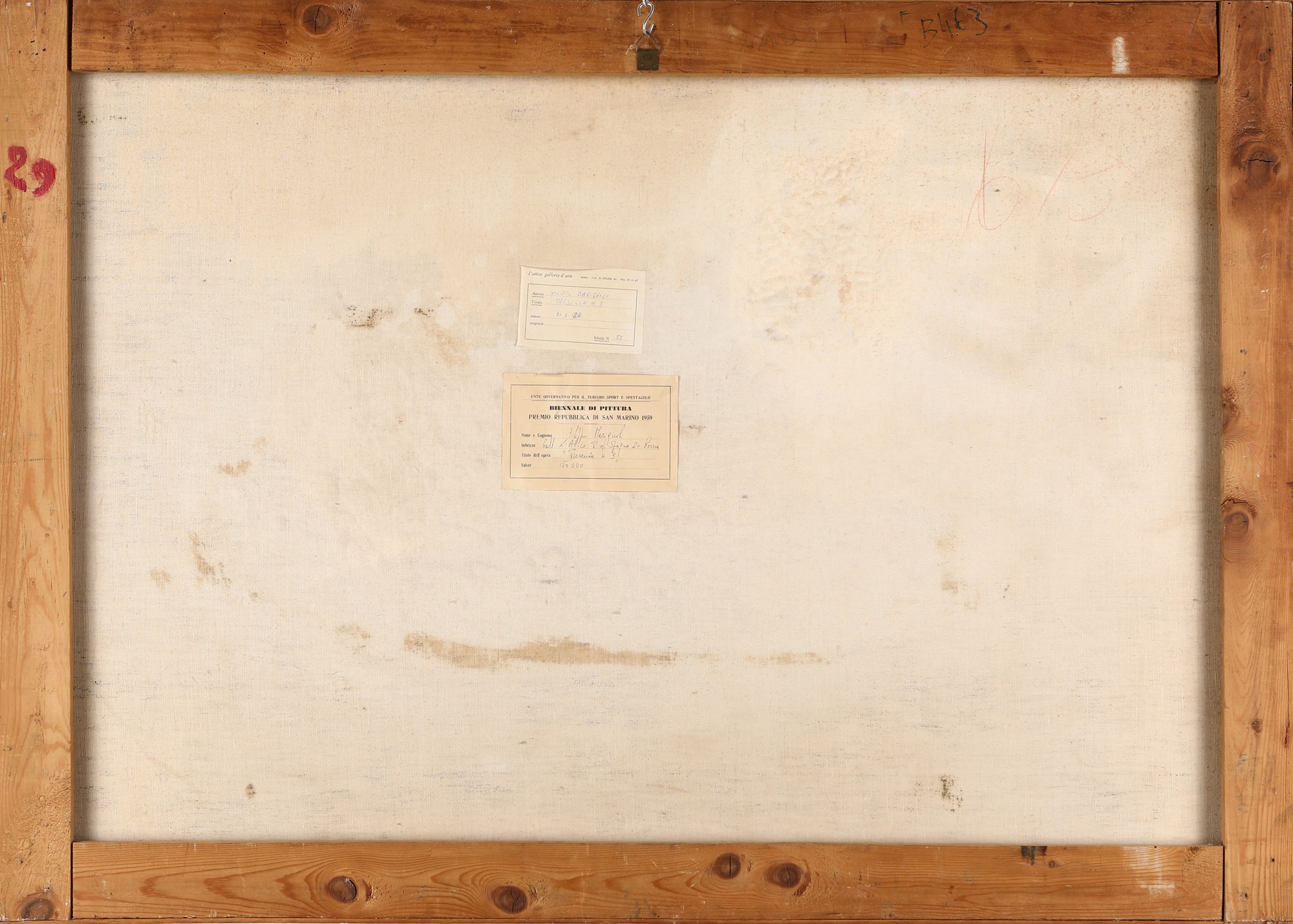 Presenza N.3 1959 Olio su tela cm 90x128 Firma in basso a destra "Marignoli 959". Al verso reca etichette della "Galleria L'attico, Roma" e della Biennale di Pittura della Repubblica di San Marino del 1959