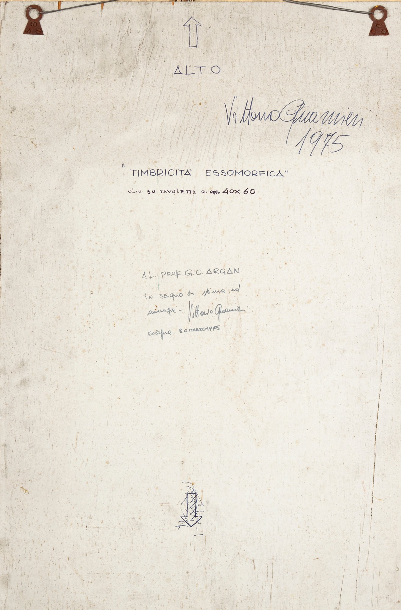 Timbricità Essomorfica 1975 Olio su tavola cm 60x40 Al verso reca firma, data, titolo e dedica "Vittorio Guarnieri / 1975 / Timbricità Essomorfica / Al Prof. G.C. Argan, in segno di stima ed amicizia, Vittorio Guarnieri, Bologna 30 Marzo 1975".