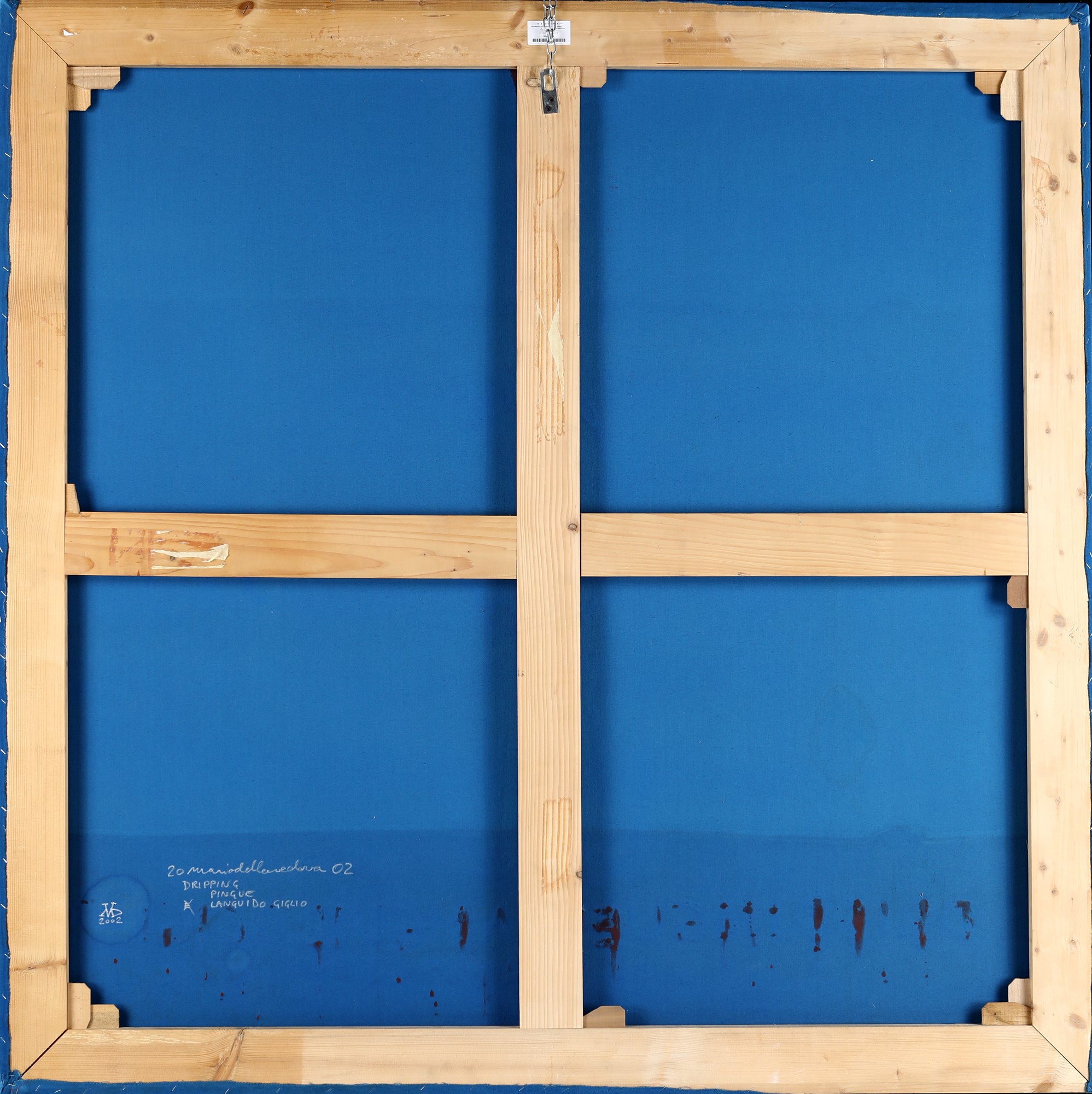 Drippinguelanguidogiglio 2002 Acrilico e smalto rosso su stoffa cm 145x145 Al verso reca firma, data e titolo "Mario Dellavedova 2002 Dripping / pingue / languido giglio". Certificato di autenticità su fotografia rilasciato dalla Galleria Emilio Mazzoli e firmato di pugno dall'artista