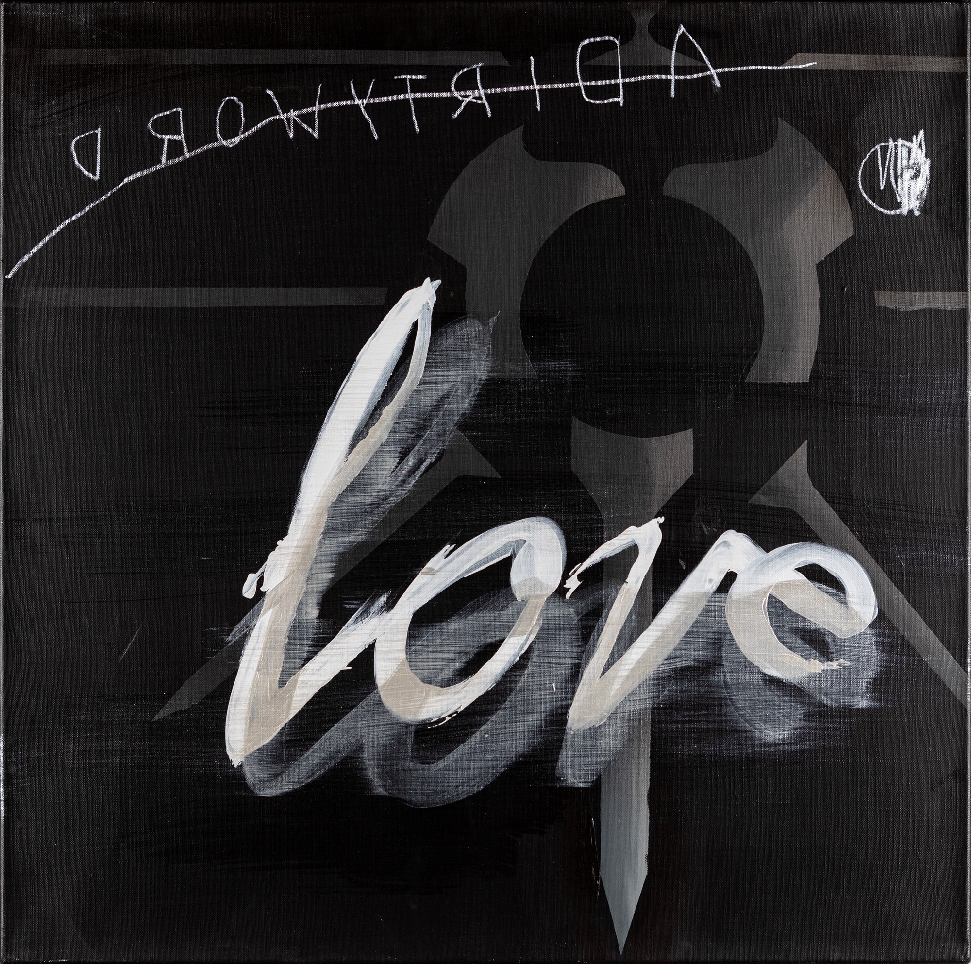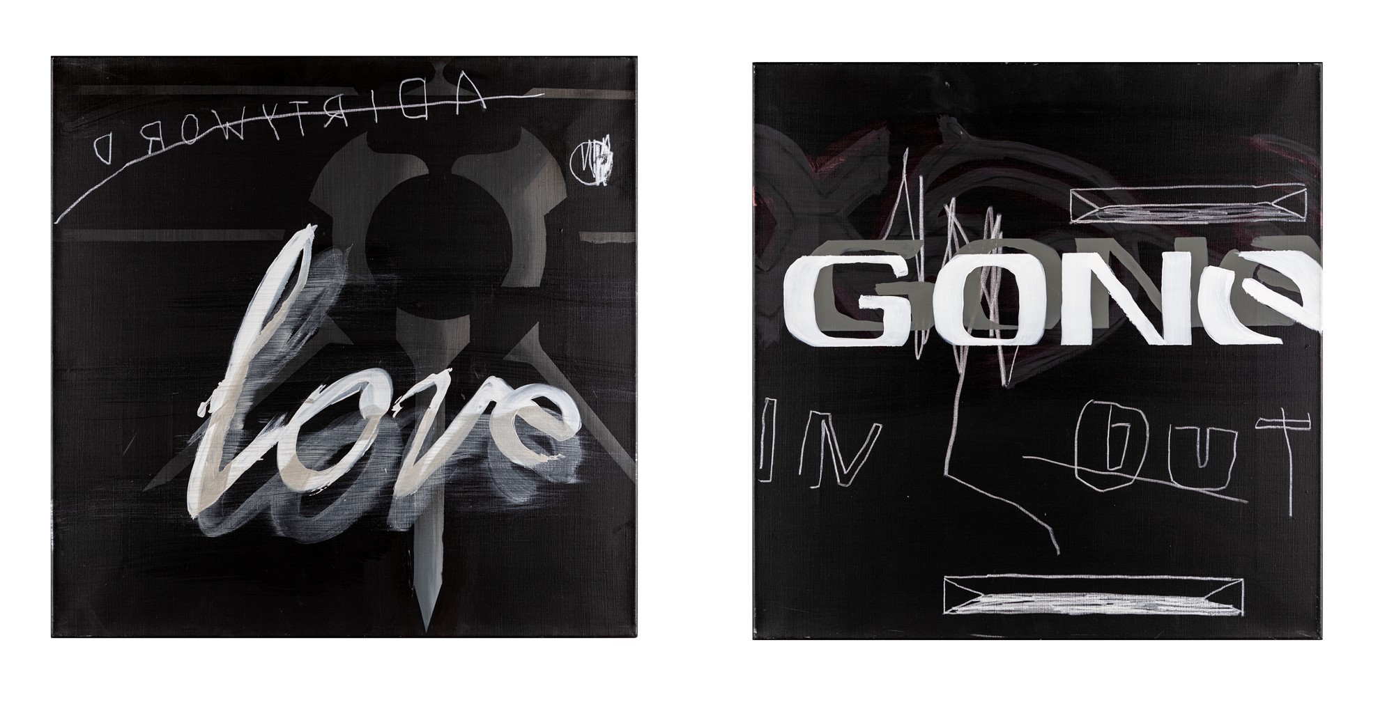 Sonics 2002 Olio e pastello su tela dittico cm 70x140 (70x70 l'uno) Entrambi firmati, titolati e datati al verso "Migliore '02, Sonics"