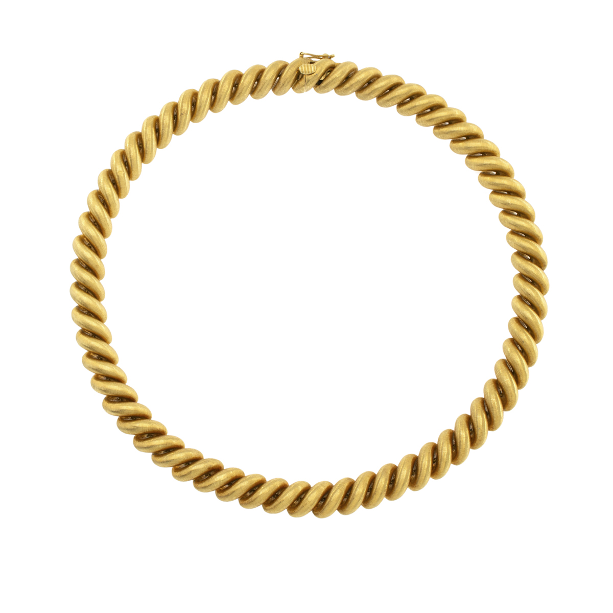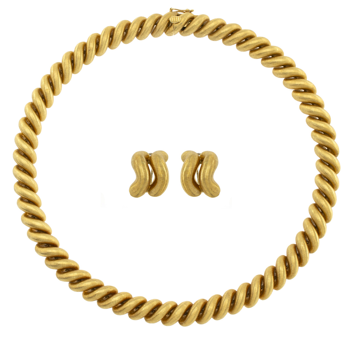 Mario Buccellati parure collezione Torchon San Marco firmata, anni 90 circa peso 124 gr. in oro giallo 18kt, composta da girocollo e orecchini a lobo, lunghezza 42 cm. e 3 cm.