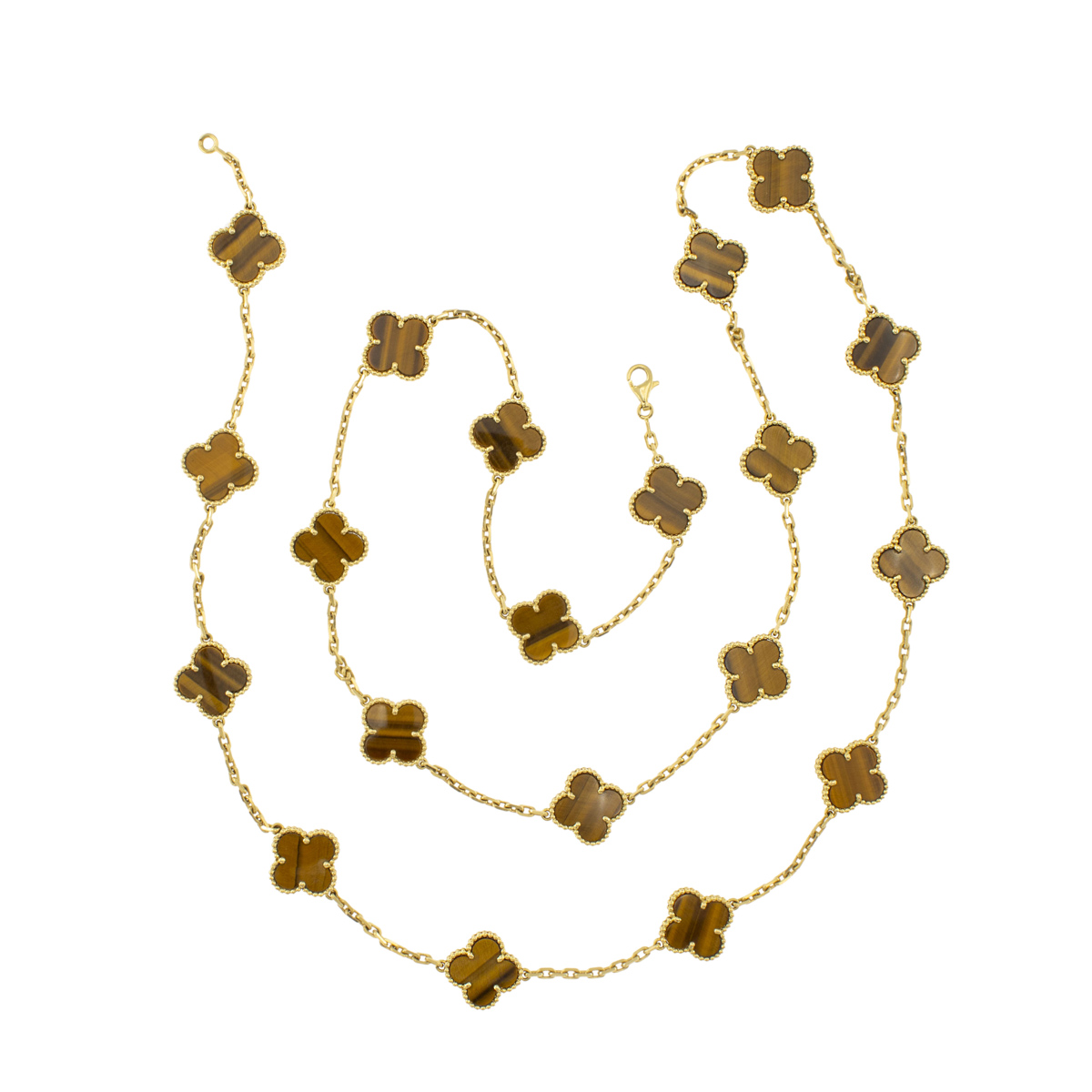 Van Cleef & Arpels Sautoir collezione Alhambra firmata e numerata, anni 70/80 peso 50 gr. in oro giallo 18kt e venti motivi a quadrifoglio in occhio di tigre, lunghezza 85 cm.