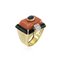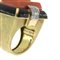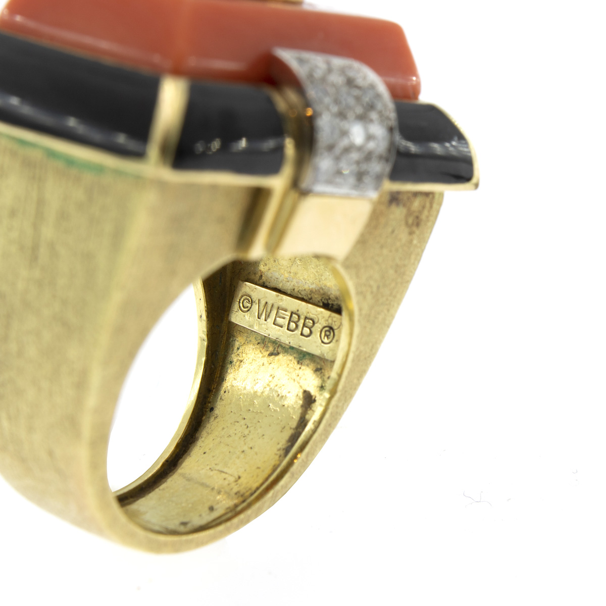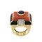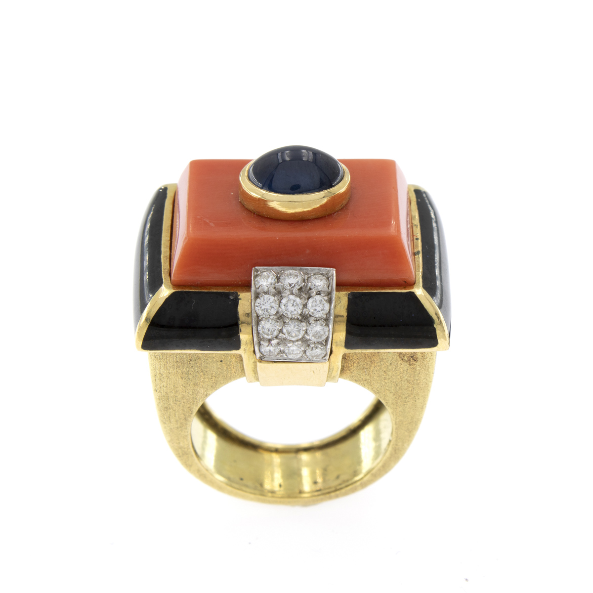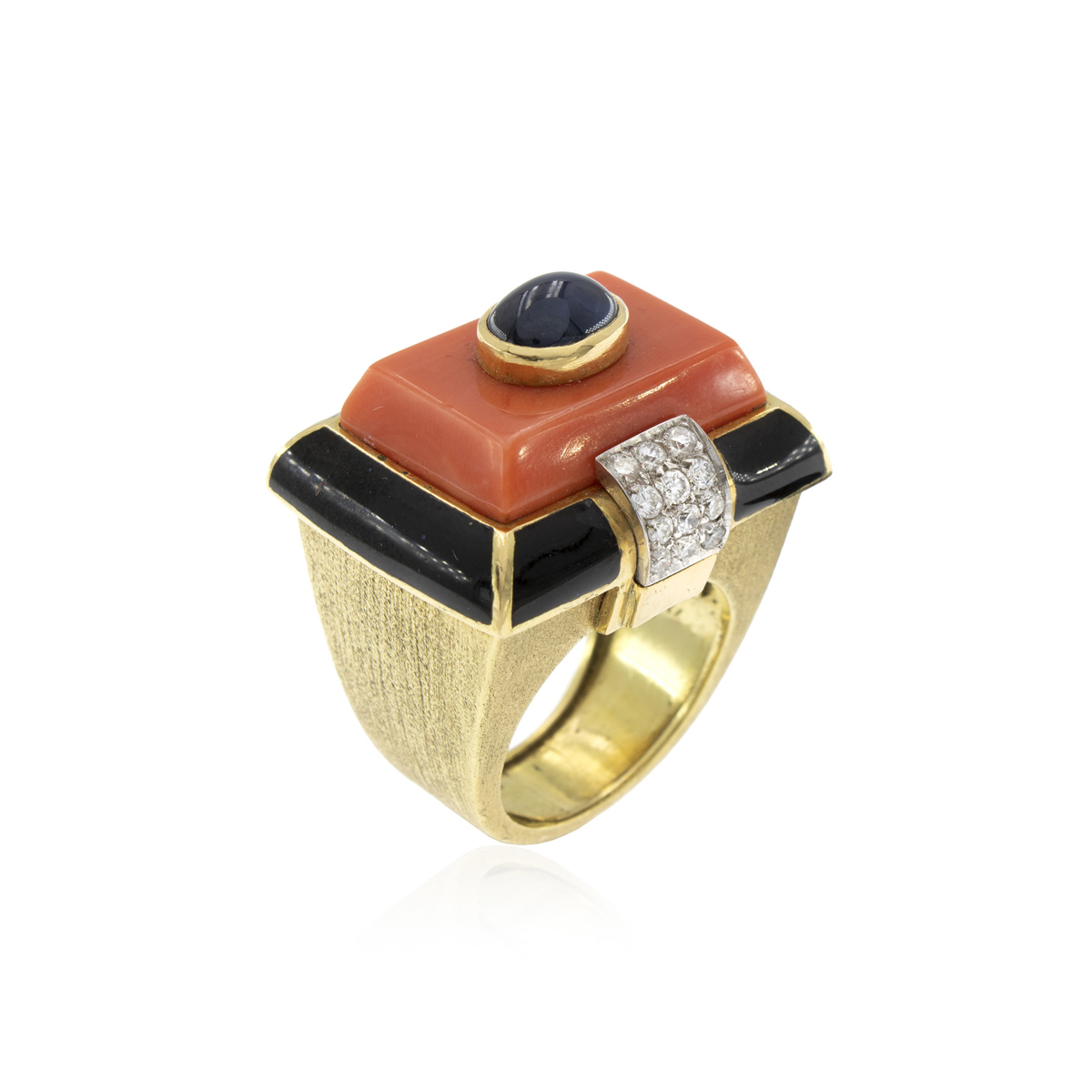 David Webb anello collezione Tablet firmato, anni 70/80 peso 30 gr. in oro giallo 18kt corallo sormontato da uno zaffiro taglio cabochon, smalto nero e diamanti taglio brillante ct 0,50 circa, misura 14