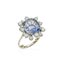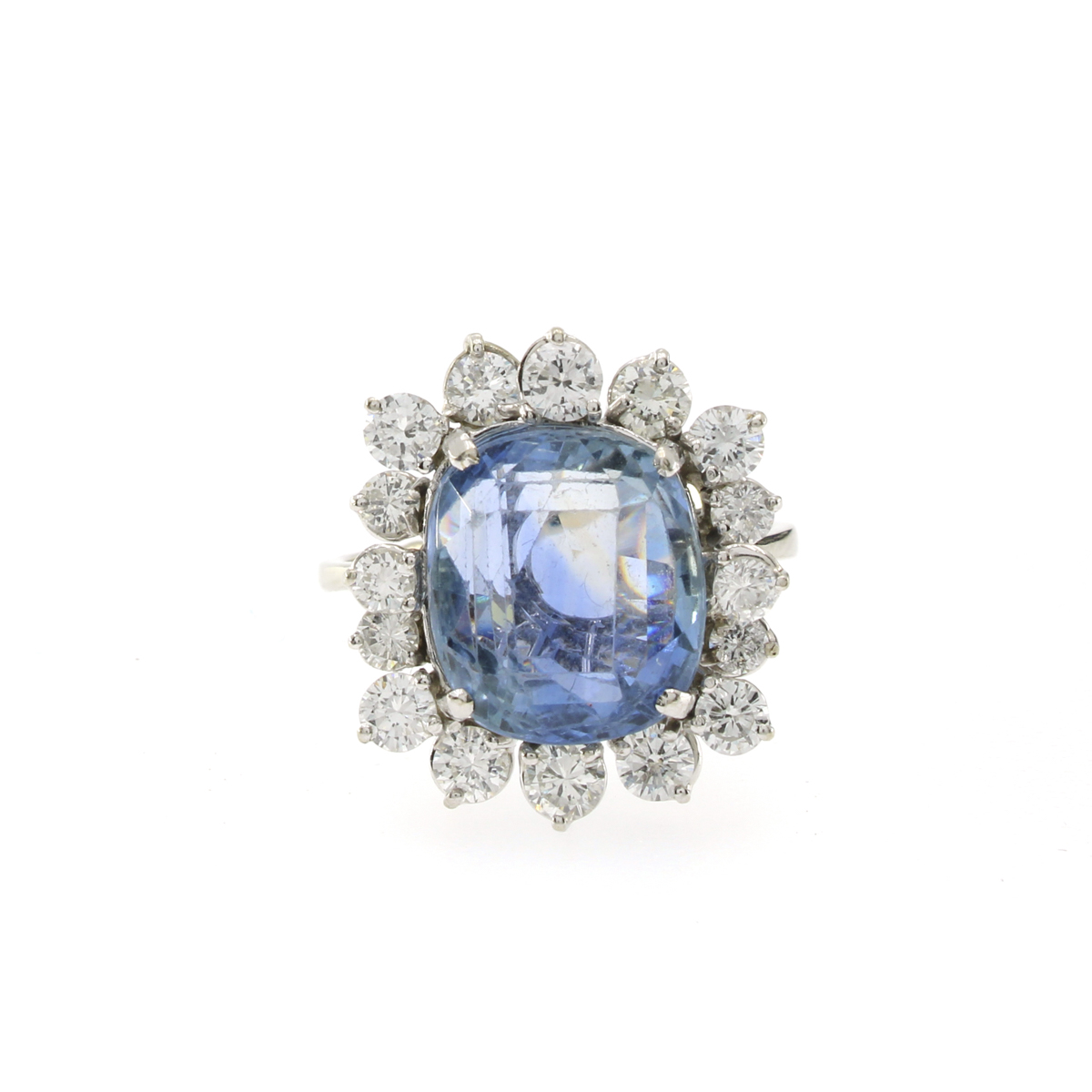 Anello in oro bianco 18kt con zaffiro naturale peso 6 gr. ct 7,50 circa privo di trattamento termico, contornato da diamanti taglio brillante ct 1,40 circa colore G/H - purezza SI, misura 8, completo di certificato gemmologico