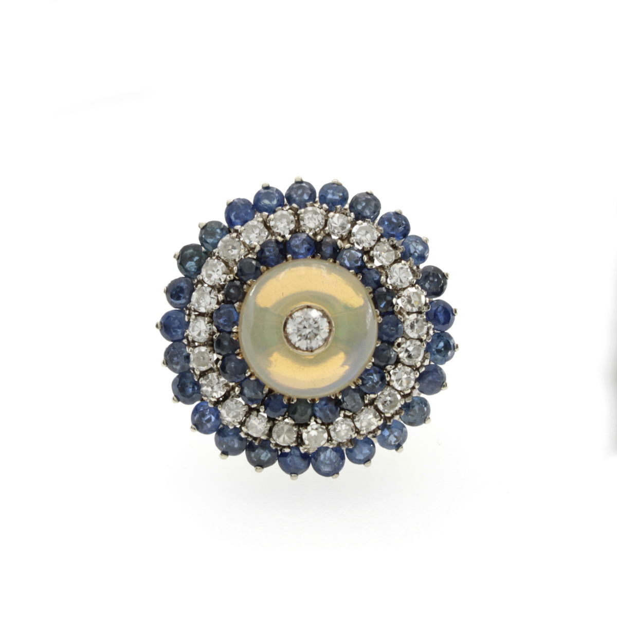 Anello in oro bianco 18kt opale arlecchino zaffiri e diamanti anni 40/50 peso 7 gr.